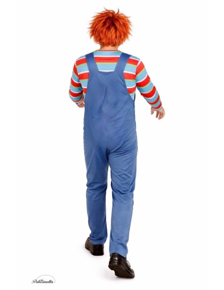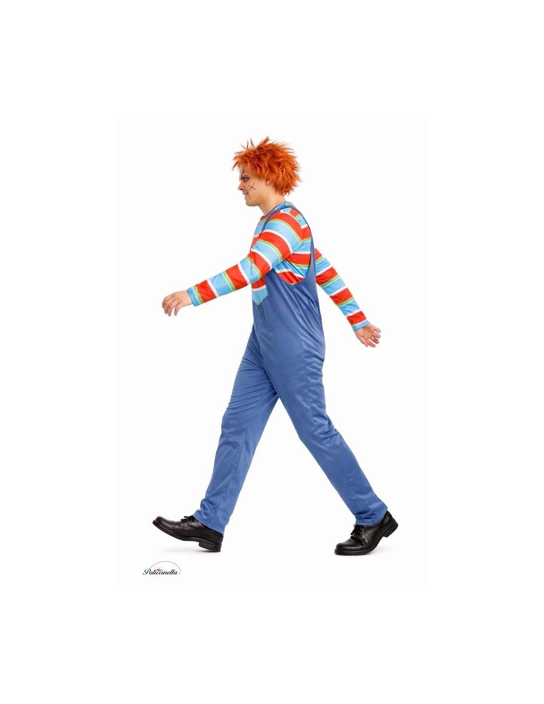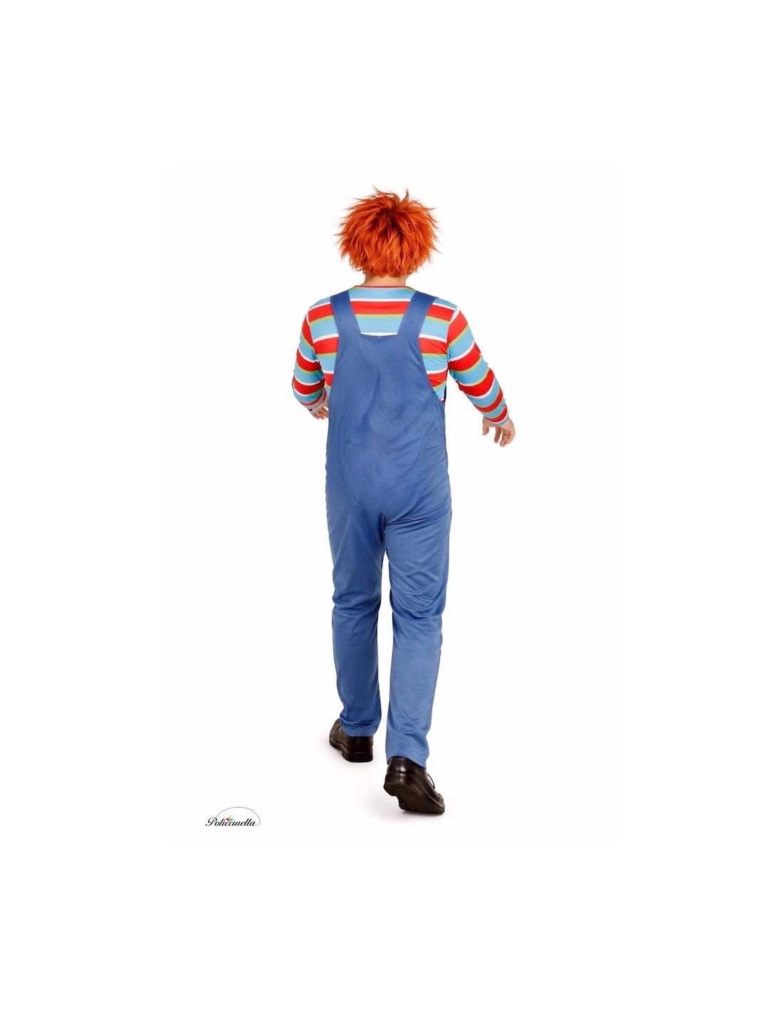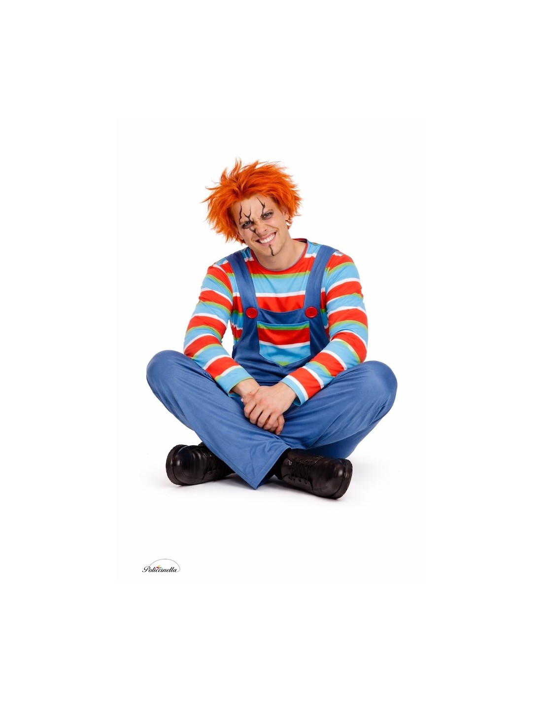 Costume terrifiantement amusant de Chucky, composé d'un t-shirt à rayures en tricot semi-élastique doux et d'un pantalon avec salopette du même tissu. La salopette comprend une braguette à fermeture éclair invisible pour plus de confort, une poche fonctionnelle à l'avant et de grands boutons décoratifs. Les bretelles se règlent à l'arrière avec un système pratique de velcro. Léger et confortable, avec des finitions soignées pour un look saisissant.
