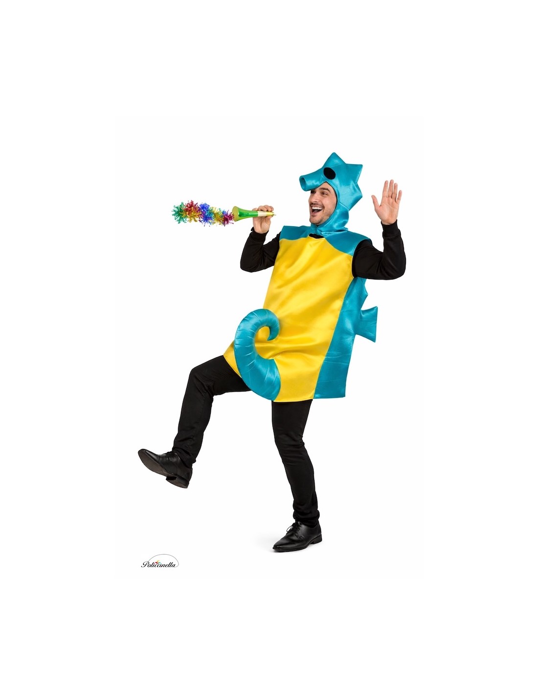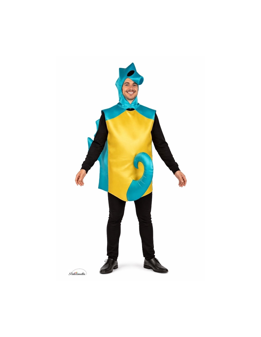 Costume de hippocampe, coloré et avec une forte présence scénique. Fabriqué en satin doux moussé, il couvre tout le corps à l'avant et à l'arrière, offrant une structure sans sacrifier la légèreté. Il comprend une pièce frontale qui simule la caractéristique queue de l'hippocampe, également moussée et cousue à la combinaison. Les ouvertures latérales permettent de sortir les bras confortablement. La capuche, indépendante et structurée, intègre deux pièces de feutre représentant les yeux du personnage, et se ferme à l'arrière avec du velcro. Couleurs vives et grand confort.