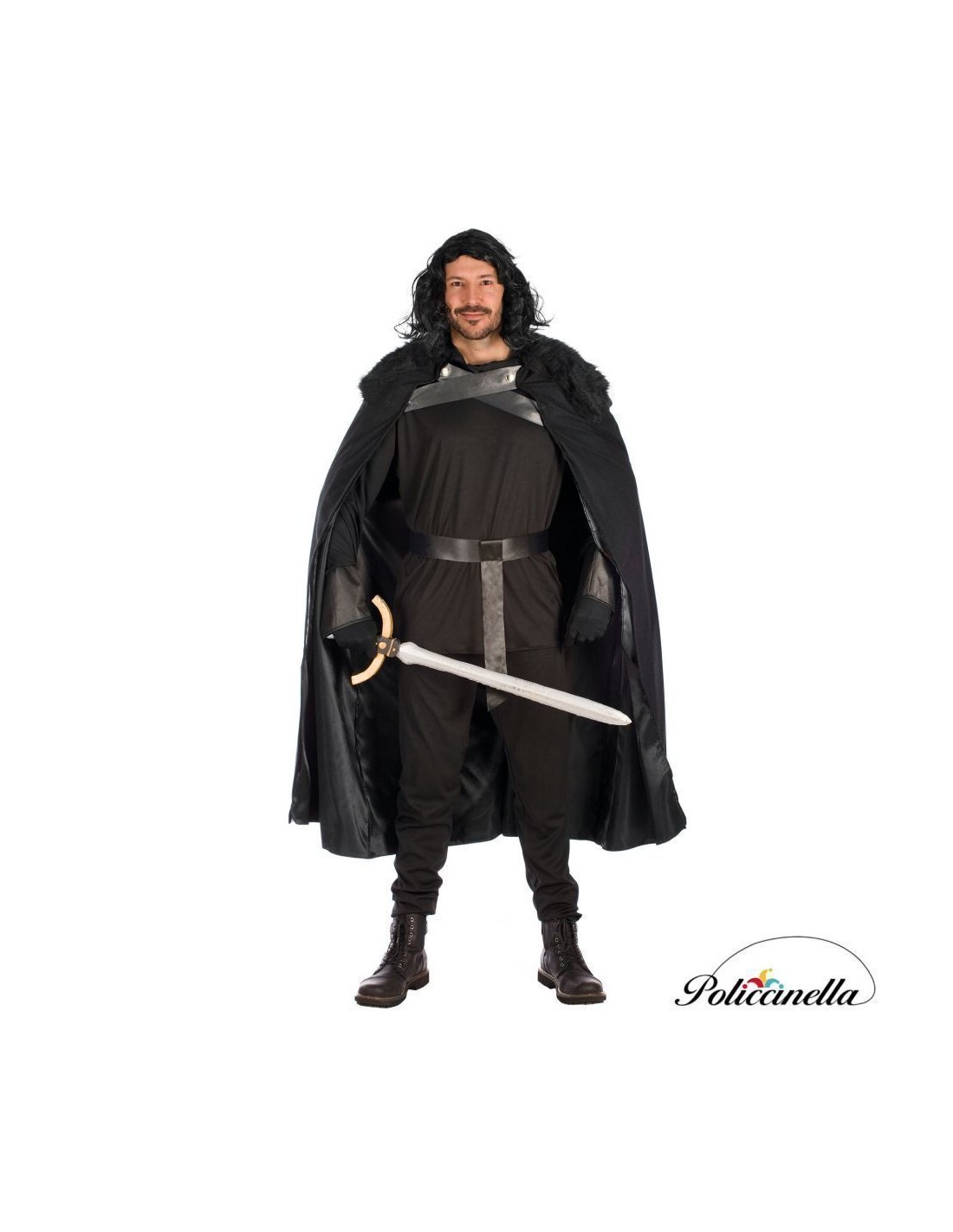 Déguisement de guerrier médiéval composé d'une chemise, d'un pantalon, d'une cape et d'une ceinture, fabriqués en tissu de maille machine pour plus de confort et de mobilité. La chemise à manches longues comporte une fermeture velcro au col. Le pantalon a une taille élastique et une poche intérieure fonctionnelle. La cape comprend un col en fausse fourrure à haute densité et une fermeture avant avec des lanières croisées en similicuir polyester et des décorations en plastique. La ceinture, renforcée en feutre, se règle par velcro. Design technique, léger et polyvalent.