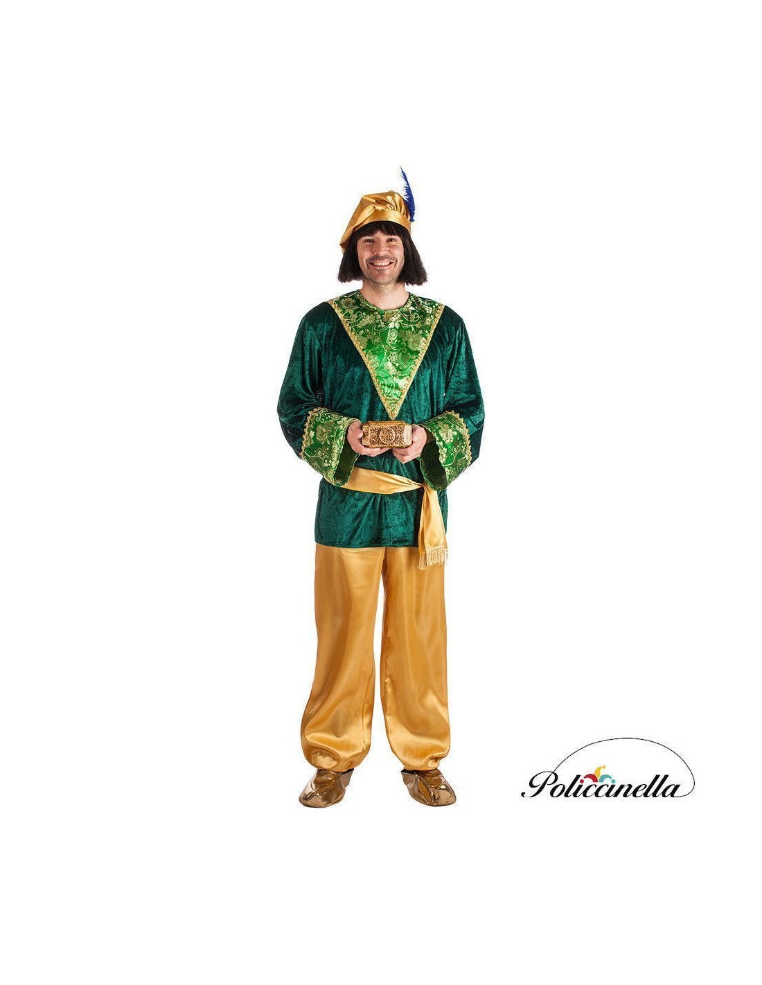 Ce costume de page éblouit par sa confection de grande qualité et l'élégance de ses finitions. La veste, en velours vert au toucher doux, se ferme au col avec du velcro et présente un devant spectaculaire ainsi que des manches décorées de tissu brocart de type damas et de galons dorés qui lui confèrent un air majestueux. Le pantalon, en satin doré, comporte de l'élastique à la taille et aux chevilles pour un ajustement confortable, tandis que la ceinture, également en satin, est ornée de franges dorées qui ajoutent de la distinction. Le bonnet bouffant, en satin assorti et surmonté d'une plume, complète l'ensemble. Le joyau du costume est sans aucun doute le luxueux brocart de la veste, qui apporte authenticité et noblesse. Un costume doux, voyant et distingué, idéal pour les défilés, les crèches vivantes et les célébrations de Noël pleines de tradition.