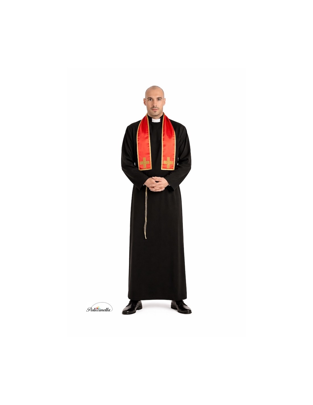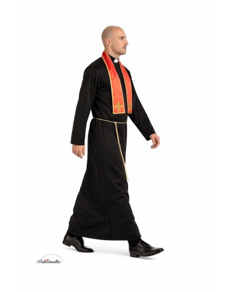 Costume élégant et réaliste de prêtre composé d'une soutane longue en polyester dense et doux, avec un col romain incorporé et une fermeture pratique à velcro à l'arrière, au niveau du cou. Il comprend une étole en satin avec une bordure dorée et des croix dorées en relief, fixées à la pièce, qui apportent une touche solennelle et authentique. L'ensemble est complété par une corde en nylon pour ajuster la taille, assurant une finition impeccable et professionnelle.