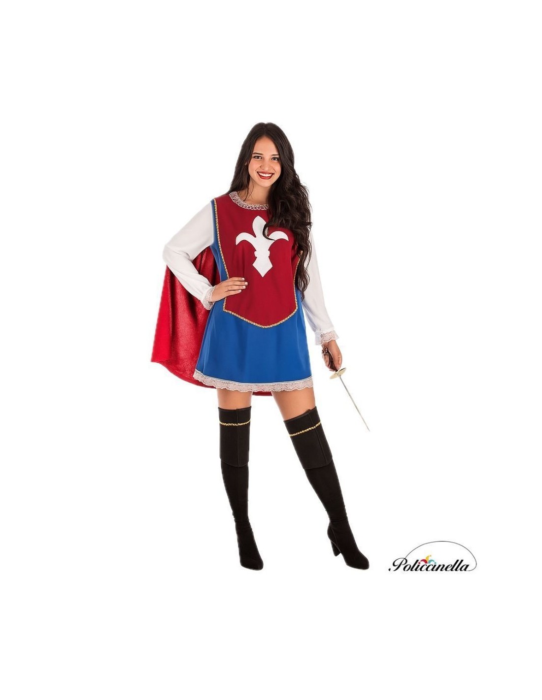 Élégant déguisement de mousquetaire alliant style et confort. La robe, en doux jersey semi-élastique, arbore une pièce frontale de couleur vin au toucher velouté simulant une armure avec un bouclier, attachée aux épaules et ajustable grâce à un laçage arrière. Le col et les manches sont ornés de galons et de dentelle, se terminant par des poignets élastiques pour un ajustement parfait. Une cape veloutée de couleur vin tombe des épaules, fixée par du velcro pour plus de confort. L'ensemble est complété par des guêtres de bottes en mousse ornées de fins galons, apportant une touche noble et distinguée digne de toute mousquetaire.