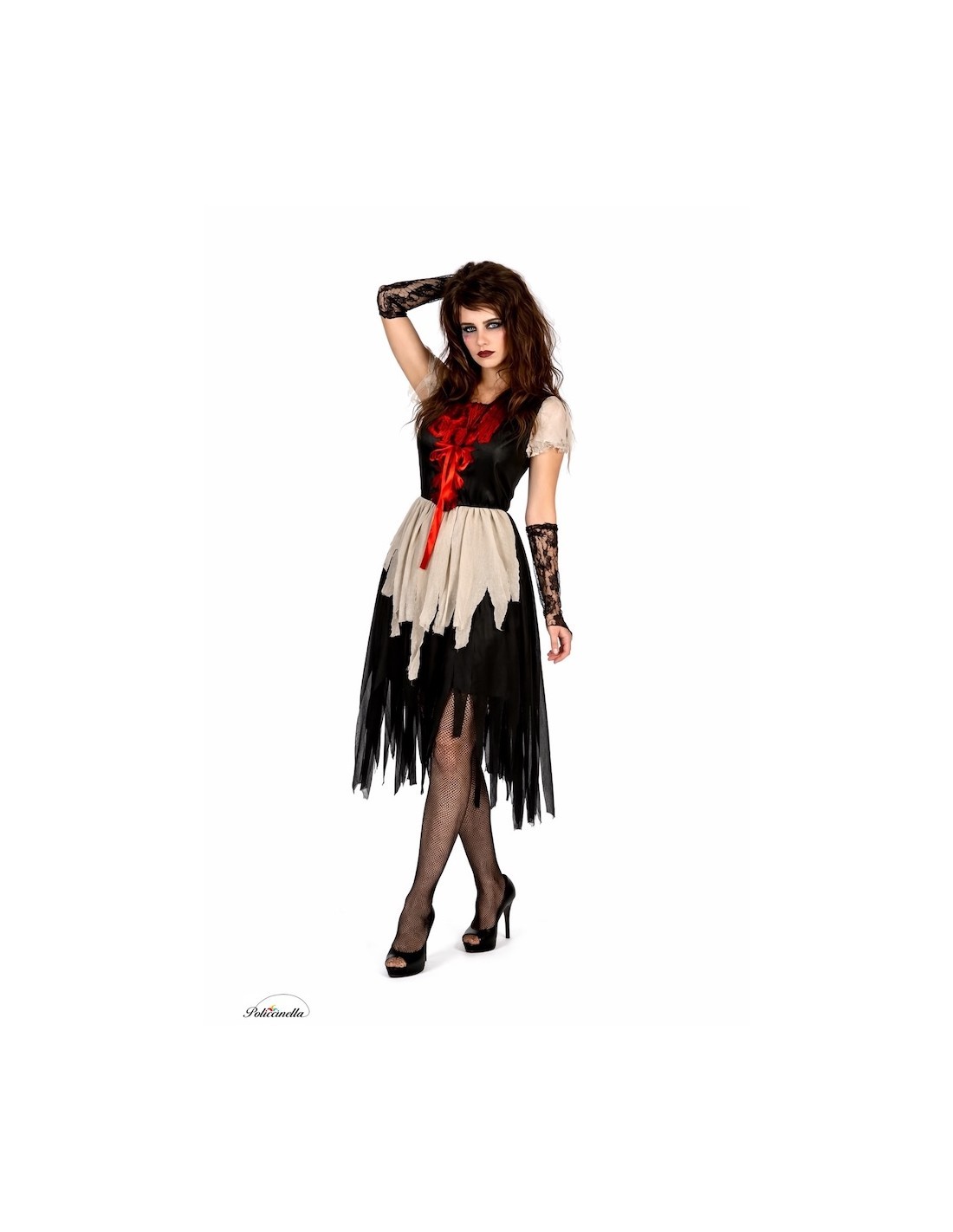 Robe confectionnée dans un doux tricot de machine semi-élastique, avec un corsage effet cuir intégré sur une base de TNT qui apporte de la structure sans compromettre le confort. À noter la fermeture frontale en zigzag avec un ruban de satin et l'élégant col carré avec de l'élastique sur la poitrine, décoré de dentelle pour une touche raffinée et mystérieuse. Les manches élastiques sont ornées de morceaux de tissu doux et vaporeux, répétés dans la jupe froncée pour un effet aérien et sombre. Tout le vêtement est conçu pour être léger, très confortable et facile à porter pendant des heures. Comprend des gants en dentelle délicate, avec de l'élastique au doigt du milieu pour assurer leur maintien, et un autre élastique au coude pour un maintien supplémentaire.