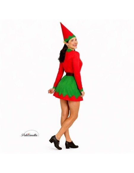 Robe charmante en tricot machine semi-extensible, douce au toucher et avec une taille froncée pour un ajustement flatteur. Encolure et jupe en texture veloutée, décorées d'appliques dorées en forme de bouton qui apportent une touche brillante et festive. Le tablier marron, cousu à la jupe, ajoute un clin d'œil traditionnel au design. Comprend une ceinture en feutre avec boucle dorée et fermeture velcro, et un bonnet conique avec bordure veloutée et décoration dorée sur le sommet. Un ensemble de grande qualité pour une elfe inoubliable.