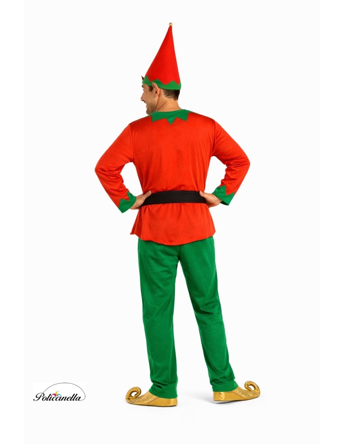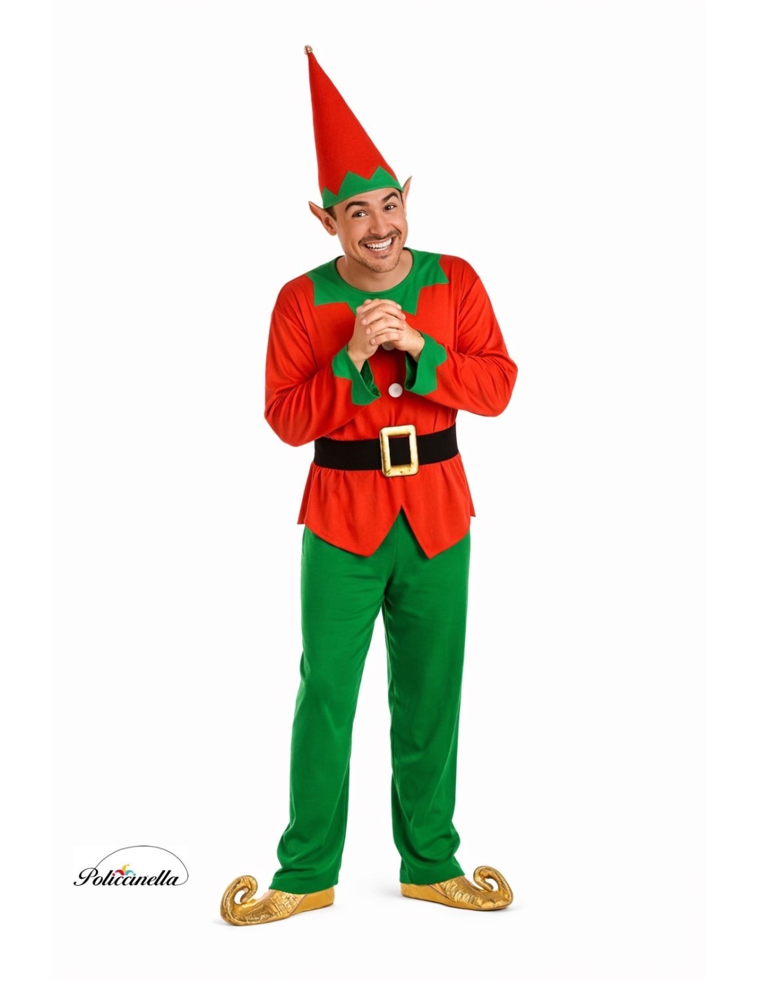 Ensemble coloré composé d'une chemise en maille de machine semi-élastique, avec un col et des poignets au toucher velouté et des pièces dorées décoratives attachées au vêtement. Fermeture arrière avec velcro pour plus de confort. Pantalon vert avec une texture veloutée, taille élastique et petite poche intérieure. L'emblématique chapeau, confectionné en feutre dense avec un liseré vert et une pointe dorée, apporte une touche festive et joyeuse. Comprend une ceinture en feutre avec fermeture velcro et boucle dorée. Parfait pour afficher charme et joie de Noël.