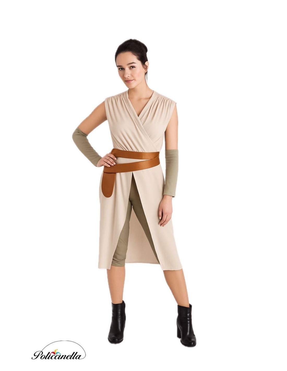 Un design inspiré par l'aventure spatiale, confectionné dans un doux tricot semi-élastique effet coton qui apporte confort et légèreté. Le t-shirt à col en V intègre deux pièces croisées à l'avant pour mettre en valeur la silhouette, maintenues par une ceinture en polyester avec base en TNT qui apporte de la structure et se ferme à l'arrière avec du velcro. L'ensemble comprend un pantalon assorti, avec une taille élastique, une poche intérieure et un élastique au bas pour un ajustement confortable au genou. Pour compléter la caractérisation, il y a des manchettes avec élastique au coude qui assurent une tenue parfaite. Un costume de grande confection, pratique et plein de détails évoquant la force et le style galactique.
