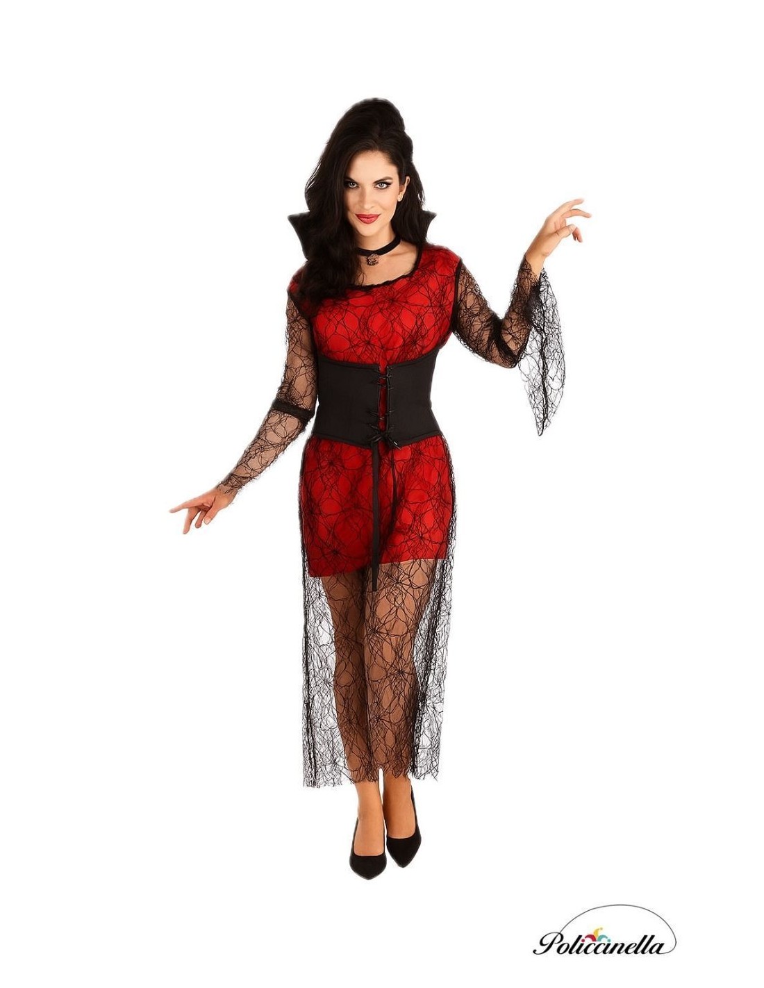 Un design élégant et mystérieux pour briller à Halloween. La robe, de coupe droite, est fabriquée dans un doux jersey semi-élastique, recouverte d'une délicate cape de dentelle avec un motif de toile d'araignée qui apporte texture et fantaisie. Le col haut structuré et légèrement rembourré maintient sa forme, donnant de la prestance à l'ensemble. La robe est accompagnée d'un corsage, fabriqué dans le même tissu et renforcé de mousse pour définir la silhouette. Elle se ferme à l'arrière avec un laçage et à l'avant avec un système croisé en zigzag, inspiré des tenues gothiques classiques.