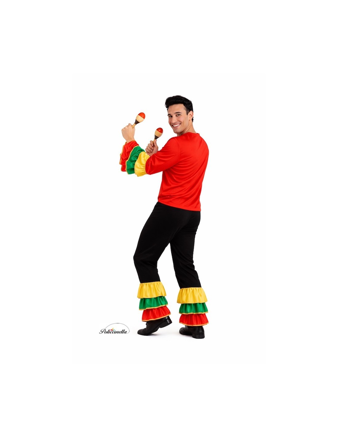 Éblouissez avec rythme et couleur avec ce joyeux costume de rumbero pour adulte. Il comprend une chemise en tricot semi-élastique, légère et confortable, avec des manches décorées de volants en satin multicolore vibrant, garnis de rubans dorés. Le pantalon assorti, avec une taille élastique et une petite poche intérieure, reprend la même décoration sur les jambes, créant un ensemble harmonieux et voyant. Idéal pour les défilés, les performances, les fêtes à thème ou toute célébration nécessitant mouvement, énergie et style tropical.