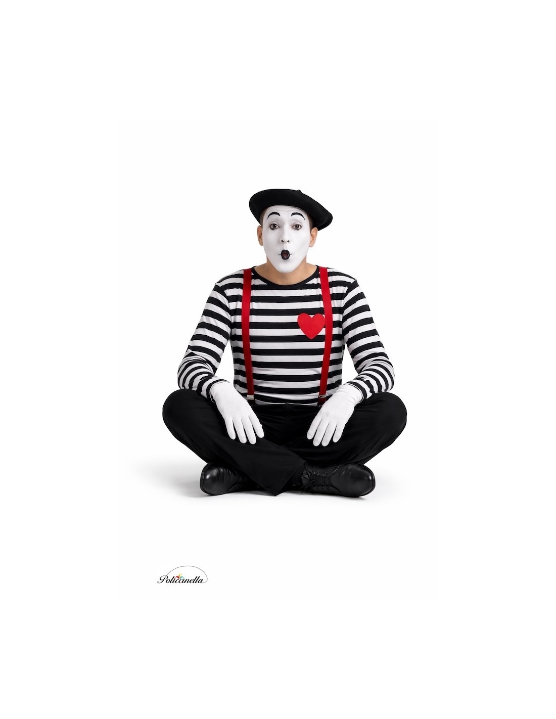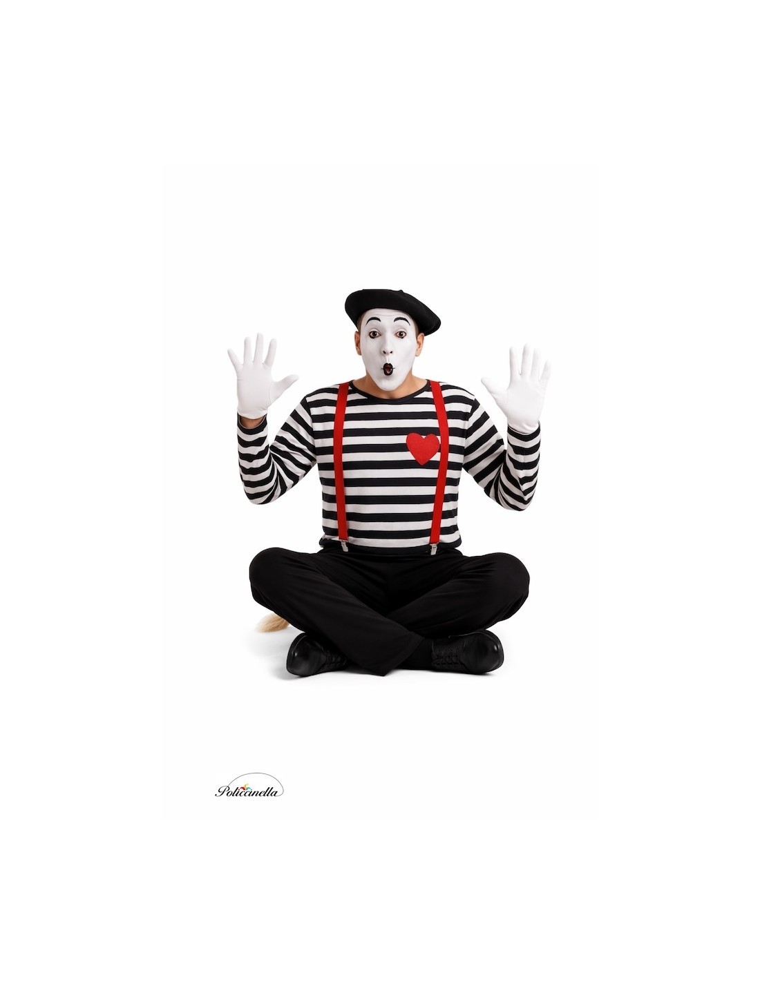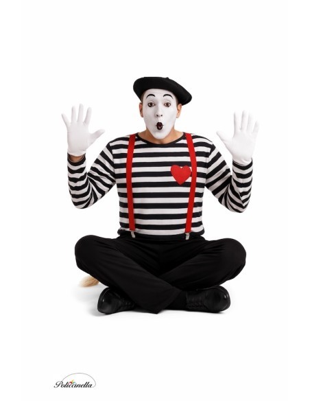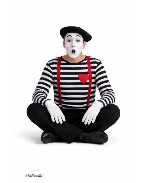 Déguisement de mime classique et charmant pour adulte, confortable et très complet. Il comprend un t-shirt en maille semi-extensible au toucher doux et avec un détail en poitrine en filtre dense, solidement fixé. Le pantalon assorti est doté d'une taille élastique et d'une poche intérieure. Il est complété par une casquette de type pêche, structurée avec une base en mousse pour maintenir sa forme, et des bretelles fonctionnelles avec des appliques métalliques. Léger, polyvalent et fidèle au style traditionnel, il est idéal pour le théâtre, le Carnaval ou les animations avec une touche artistique et authentique.