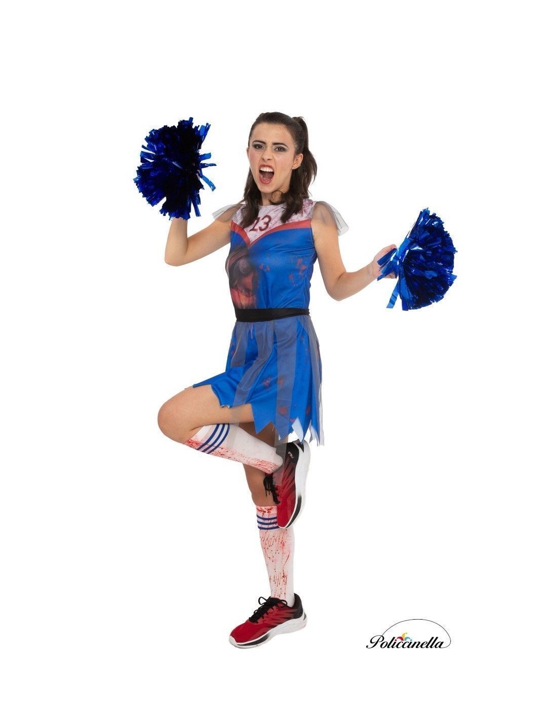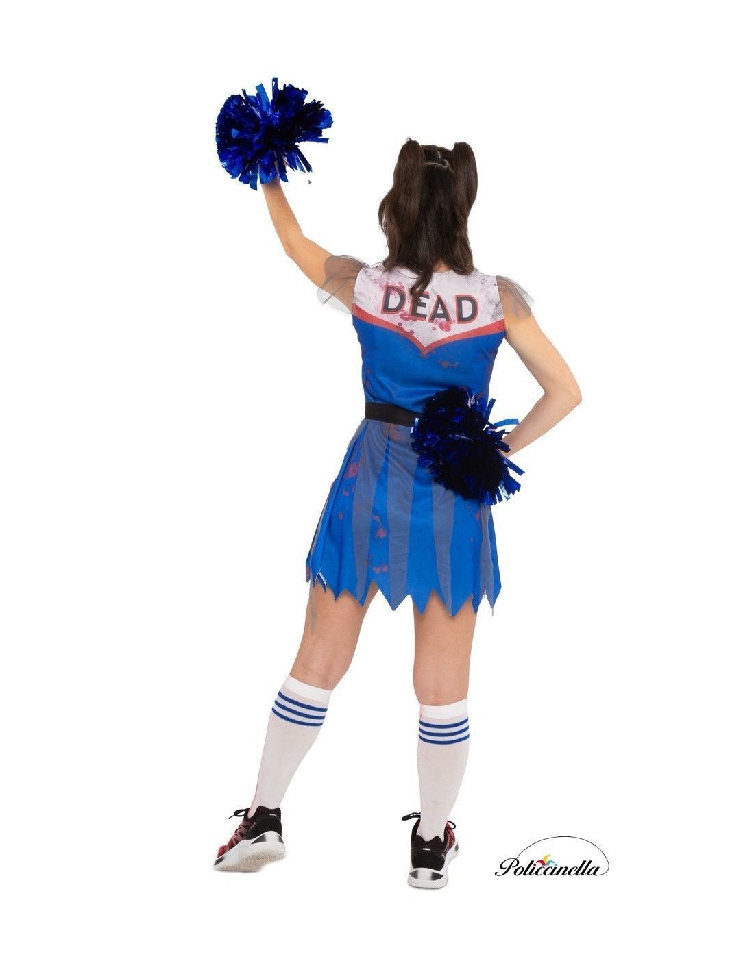 Ce déguisement de pom-pom girl zombie est composé d'une robe bleu électrique, fabriquée en tricot machine avec un design imprimé numériquement. La robe se ferme à l'arrière avec un système de velcro et comprend une ceinture à la taille qui se ferme également avec du velcro et est décorée de morceaux de tulle tombant sur la jupe. De plus, elle comporte un détail décoratif de tulle gris sur les épaulettes. Le déguisement est complété par des chaussettes montantes imitant des éclaboussures de sang et trois bandes bleues près du haut.