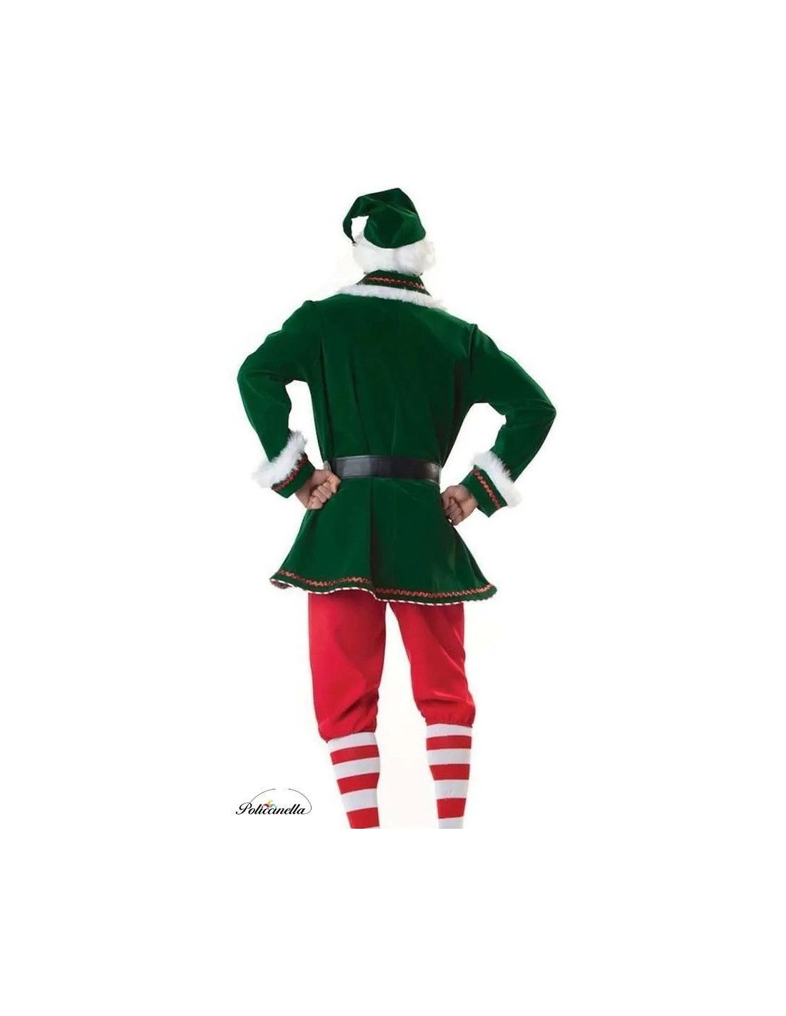 Ce raffiné déguisement de lutin elfe de Noël se distingue par la haute qualité de ses tissus et l'excellence de chaque finition. Fabriqué en velours doux et résistant, il allie confort et élégance pour être porté lors de célébrations et événements de Noël. La veste, avec une fermeture éclair centrale, est ornée d'un joyeux motif de bonbons et embellie de col et poignets en fausse fourrure blanche bordés de rouge, apportant un contraste festif et charmant. Le pantalon, également en velours, intègre une taille élastique pour un ajustement confortable, tandis que les chaussettes en tricot épais assorties complètent le style hivernal. Il comprend également des pantoufles et une ceinture en polyester aspect cuir, qui apportent réalisme et solidité à l'ensemble. Le costume est couronné d'un bonnet en velours décoré de fausse fourrure douce, en faisant une tenue complète, résistante et imposante.