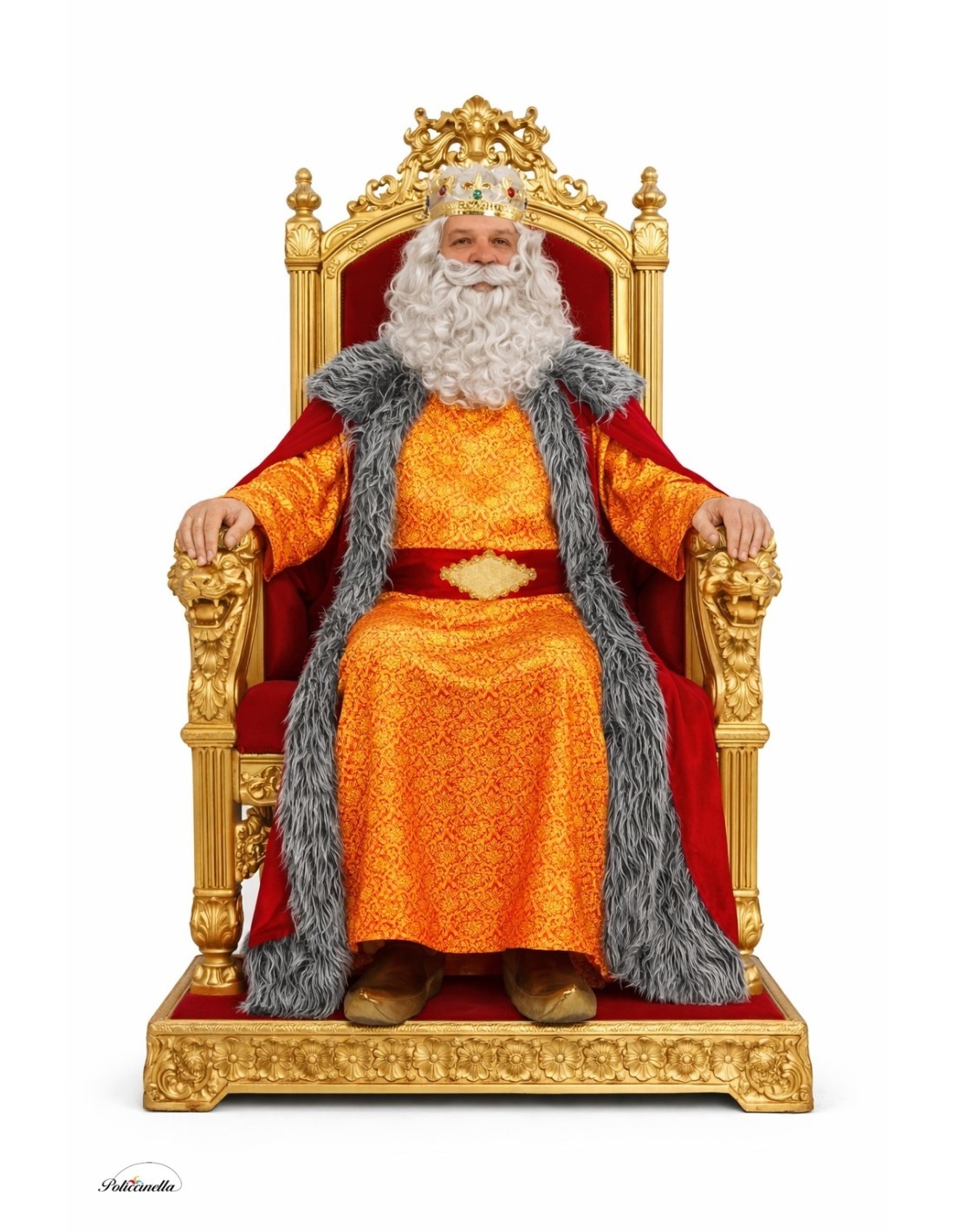 Ce majestueux costume de Roi Melchior transmet la grandeur et la solennité d'un monarque de l'Orient grâce à la richesse de ses tissus et finitions. La veste longue, confectionnée en satin rouge avec un délicat imprimé doré, apporte une allure royale et lumineuse. Par-dessus repose un imposant manteau de velours, orné d'une dense fourrure grise bouclée qui rehausse l'élégance et la distinction de l'ensemble. La ceinture en velours, décorée d'un détail frontal et d'une fermeture à velcro à l'arrière, assure le confort sans perdre en noblesse dans son apparence. La tenue est complétée par des couvre-chaussures dorés de type babouche, fabriqués en mousse pour maintenir leur structure impeccable et offrir une finition uniforme. Un costume de grande qualité, idéal pour les défilés et les représentations nécessitant un style authentique et distingué.