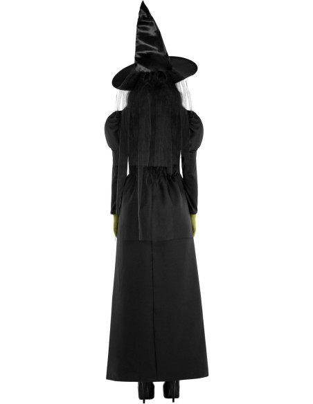 Un ensemble qui allie mystère et distinction. La robe, confectionnée en polyester doux et dense, présente un design long avec une taille élastique qui s'adapte confortablement aux tailles 36 à 44. Ses manches bouffantes et les boutons décoratifs à l'avant ajoutent une touche classique, tandis que le col haut et la fermeture velcro dans le dos assurent une finition impeccable. L'ensemble est complété par un chapeau en satin résistant, avec un cercle intérieur maintenant sa forme et un tulle noir tombant jusqu'à la taille. Sa pointe légèrement courbée ajoute une touche gracieuse et unique, idéale pour les fêtes à thème ou Halloween.