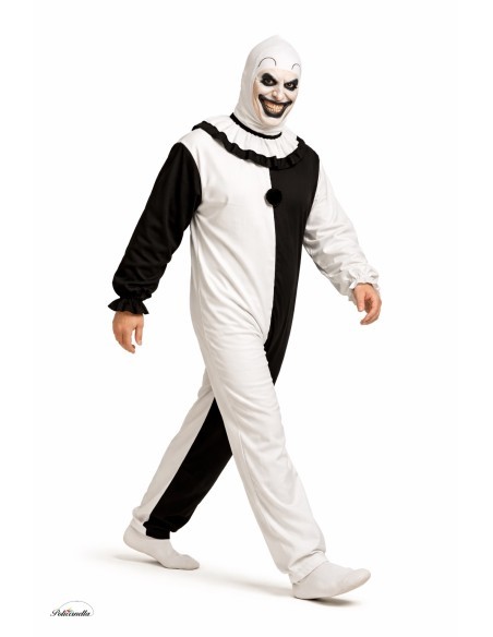 Déguisement de clown tueur idéal pour un Halloween terrifiant. Comprend une combinaison bicolore en blanc et noir et un cache-cou en tissu brossé de haute qualité. La combinaison se ferme avec une fermeture éclair invisible dans le dos et le cache-cou a des volants blancs et noirs au col avec une fermeture en velcro. Comprend un petit chapeau melon en feutre à fixer avec une épingle à nourrice (non incluse). Un look sinistre, confortable et très marquant.