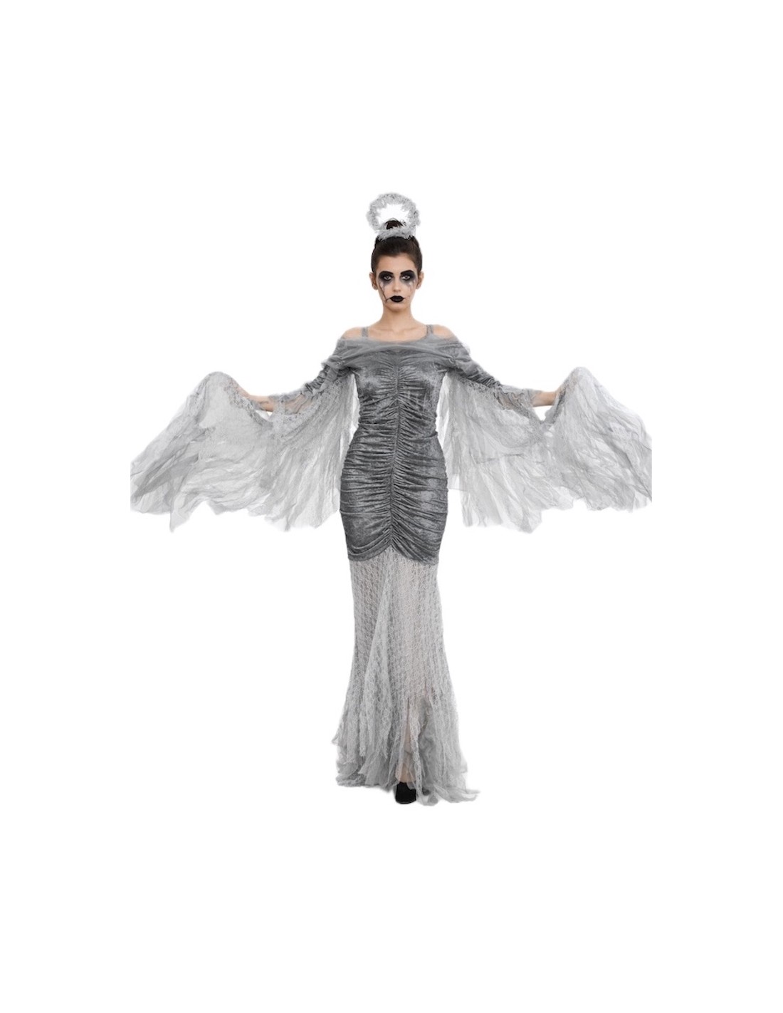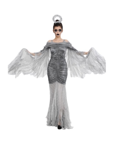 Enveloppé dans un halo de mystère, ce spectaculaire déguisement d'Ange Déchu allie élégance et caractère. Sa robe en velours drapé et semi-élastique s'ajuste confortablement des tailles 36 à 42, avec une fermeture éclair latérale et un buste renforcé pour un ajustement sûr. Une épaulette en mousseline réglable ajoute de la délicatesse, tandis que les ailes, cousues le long des bras et fixées avec un bracelet élastique au poignet et au doigt, accompagnent chaque mouvement sans effort. La jupe, aérienne et éthérée en dentelle et mousseline, offre légèreté et présence sans transparence, créant un ensemble saisissant et sophistiqué.