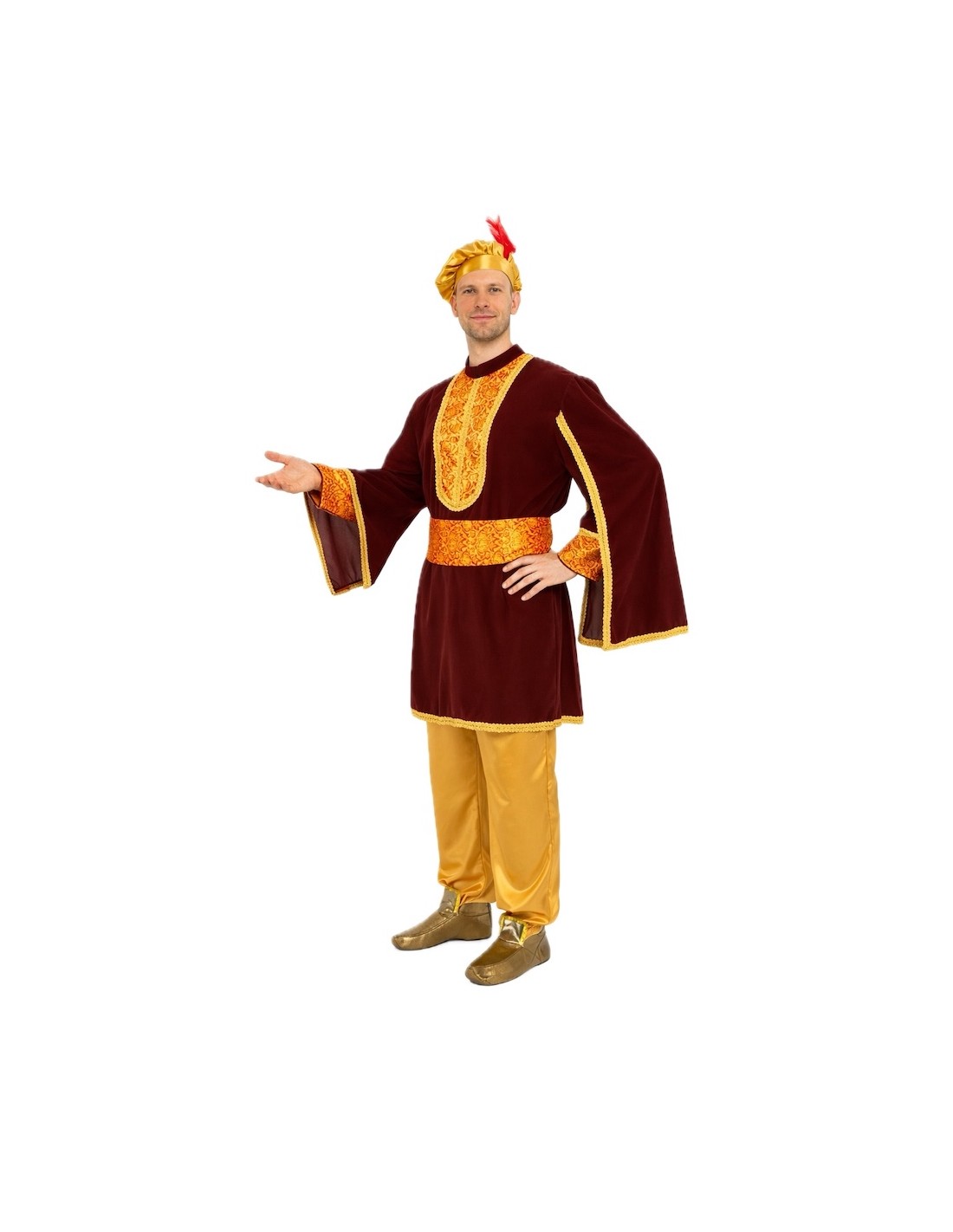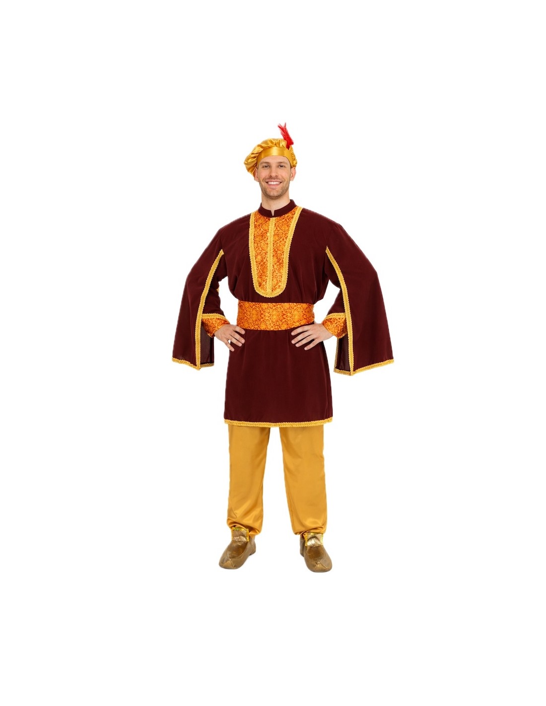 Impressionnez lors de chaque défilé avec ce distingué costume de Paje Melchor. Sa veste, au toucher velouté, associe sur le torse et les manches un élégant satin imprimé, rehaussé de passementerie dorée. Les manches en forme de cape apportent de l'ampleur et une allure majestueuse, tandis que les babouches à paillettes et le bonnet avec plume rouge ajoutent une touche festive. Comprend une ceinture ajustable avec velcro et un pantalon doré à taille élastique avec une poche interne pratique. Une création qui allie tradition, confort et élégance pour briller lors des célébrations de Noël.