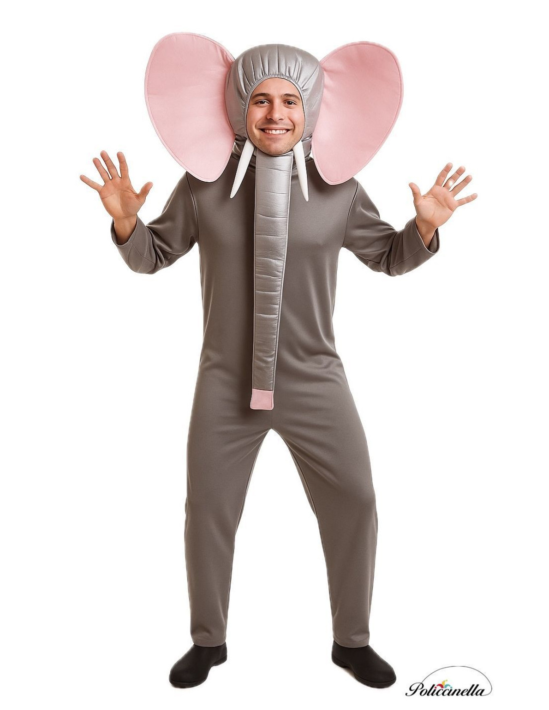 Costume d'éléphant doux et original : Il se compose d'une combinaison en tissu semi-élastique doux, avec une fermeture éclair dissimulée sur le devant pour plus de confort. La capuche comprend des oreilles en mousse qui gardent leur forme et ajoutent du volume. Au niveau du cou, deux velcros maintiennent les défenses et la trompe, tous deux rembourrés pour une finition structurée et réaliste. La trompe, en satin, se coordonne avec les oreilles, tandis que les défenses, en plastique blanc, ont un bel effet brillant.