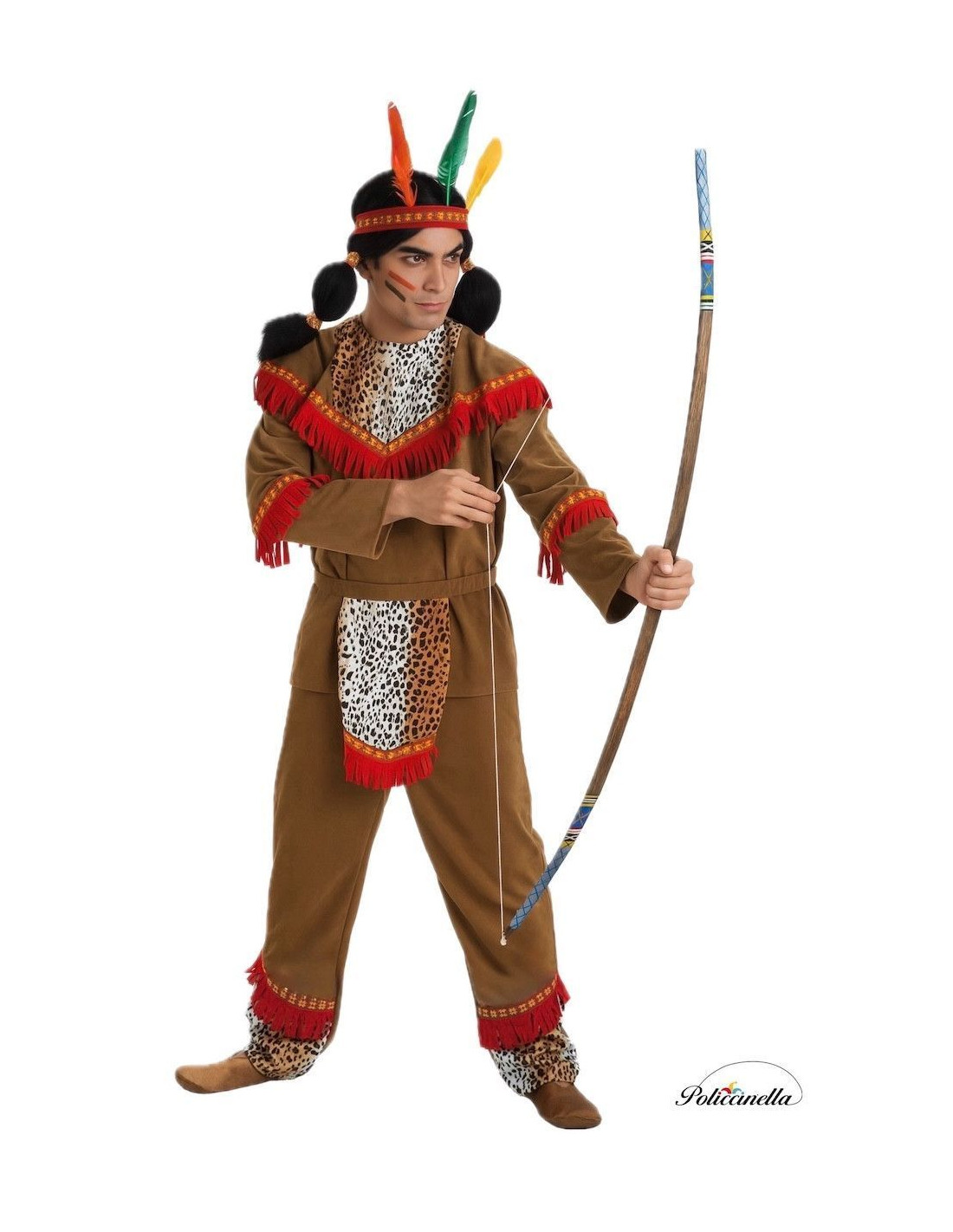 Ce déguisement, fait avec un chiffon doux similaire à Velvet, émule le costume caractéristique des Indiens de l'Ouest, qui a utilisé des peaux d'animaux chassés pour leur élaboration. Le tramp est fermé avec du velcro à l'arrière du cou. Au-dessus, une poitrine avec impression d'impression d'animaux a été préparée, décorée de franges et de courroie estampée, qui est utilisée pour le panache de tête, ajusté avec un élastique. Le pantalon, avec du caoutchouc à la taille et la poche interne, présente la même décoration sur les chevilles que la poitrine. Le costume est complété avec un mandil qui s'harmonise avec le reste du costume en termes de tons, de tissus et de détails, et convient à la taille par la descente.