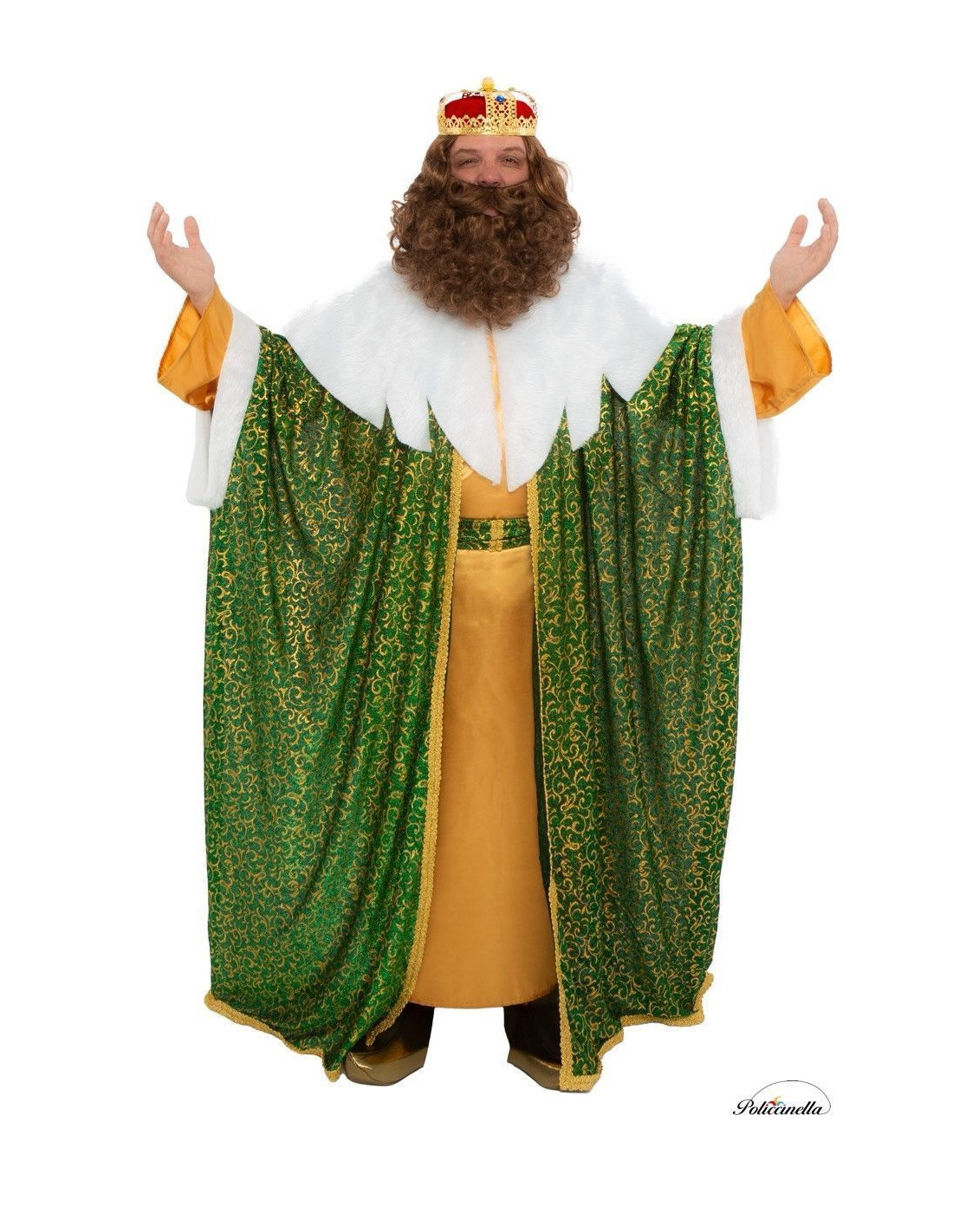 Brillez avec distinction dans ce splendide costume de Roi Gaspar, idéal pour les défilés et les représentations royales. La longue redingote dorée, fabriquée en polyester, se ferme au cou et se combine avec un imposant manteau vert à motif doré, orné de col et poignets en fausse fourrure blanche semi-bouclée. La ceinture assortie, ajustable avec du velcro, met en valeur la silhouette et apporte une touche royale, tandis que les babouches dorées complètent l'ensemble. Un costume qui allie élégance, tradition et présence majestueuse dans chaque détail. "Le motif du tissu peut légèrement varier par rapport à celui montré sur la photo, tout en conservant toujours la même qualité et le même style."