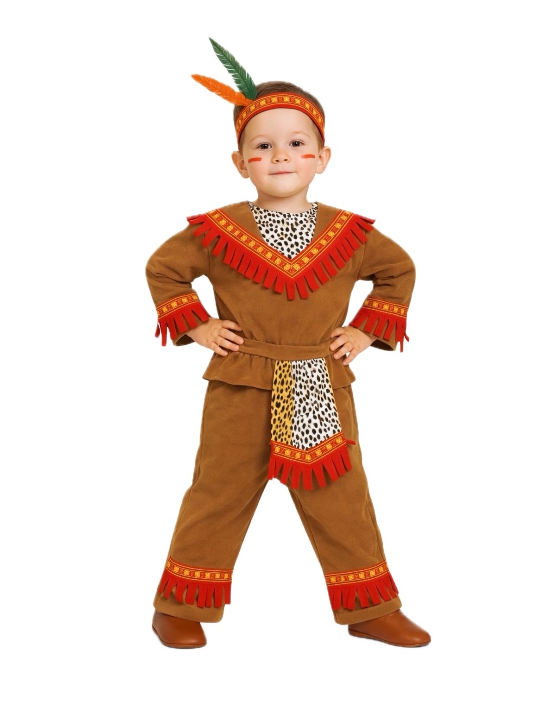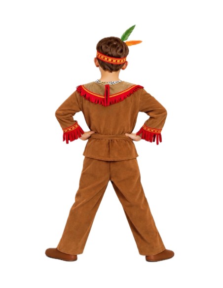 Ce déguisement, confectionné dans un tissu doux similaire au velours, imite le costume caractéristique des indigènes de l'ouest, qui utilisaient des peaux d'animaux chassés pour sa fabrication. La veste se ferme avec du velcro à l'arrière du cou. Sur celle-ci, un torse imprimé animal, agrémenté de franges et de ruban imprimé, a été confectionné, le même que celui utilisé pour la coiffe de plumes, qui se fixe avec un élastique. Le pantalon, avec une taille élastique et une poche interne, présente la même décoration aux chevilles que celle du torse. Le costume est complété par un tablier qui s'harmonise avec le reste du déguisement en termes de tons, de tissu et de détails, et se noue à la taille.
