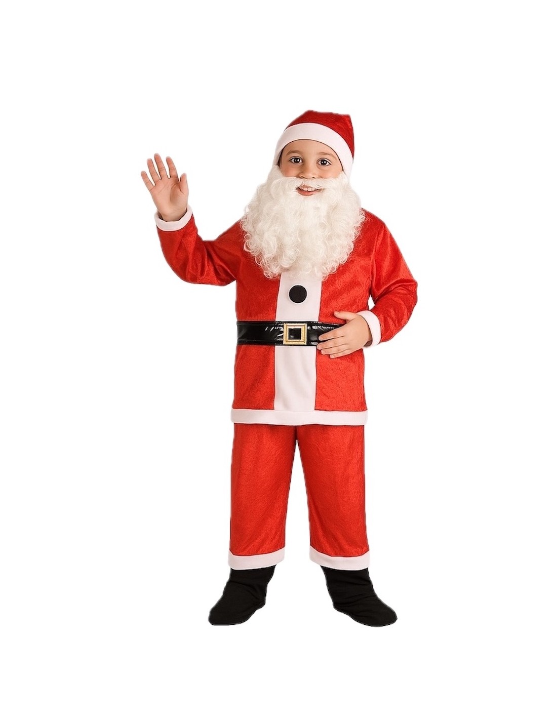 Ce costume élégant de Père Noël pour enfant se distingue par la qualité de sa confection et l'excellence de ses matériaux. Il est fabriqué en velours d'une grande douceur et densité, dense et consistant, ce qui lui donne un aspect distingué et festif. La veste se ferme avec un velcro à l'arrière du cou, a des poignets élastiques pour un meilleur ajustement et à l'avant comporte deux pièces de feutre dense imitant des boutons, ainsi qu'une ceinture en mousse avec une boucle dorée qui complète son design classique. Le pantalon, en velours identique, a une taille élastique et des couvre-chaussures intégrés avec de l'élastique à l'extrémité pour une tenue maximale. L'ensemble est complété par le traditionnel bonnet de Noël en velours assorti, orné d'un pompon sur le dessus. Un costume d'excellente qualité, confortable, résistant et parfait pour les fêtes et les représentations scolaires.