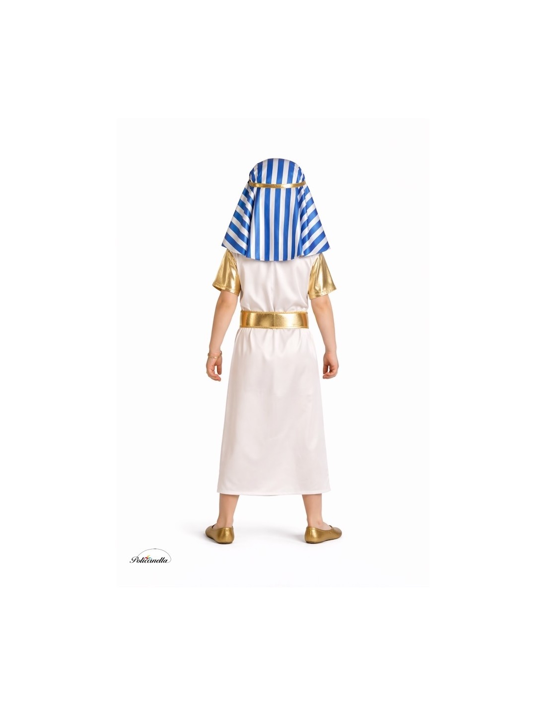 Un costume élégant qui évoque la splendeur de l'ancienne Égypte. Il se compose d'une longue tunique confectionnée en doux jersey semi-élastique, avec des manches et des fronces dorées à la taille qui lui donnent un aspect distingué. Il est accompagné d'une ceinture en TNT, ajustable avec du velcro, ornée à l'avant d'une pièce de velours bleu électrique, décorée de paillettes et d'un liseré rouge. Le col, assorti à la ceinture, se ferme confortablement par un laçage à l'arrière. L'ensemble est complété par la coiffe égyptienne typique ou némès, confectionnée en doux satin rayé, avec un élastique à l'arrière pour un bon ajustement et un décor frontal en mousse dorée avec des paillettes, qui met en valeur le style pharaonique. Un déguisement de grande qualité, coloré et confortable, idéal pour des représentations historiques, le carnaval ou des fêtes à thème.