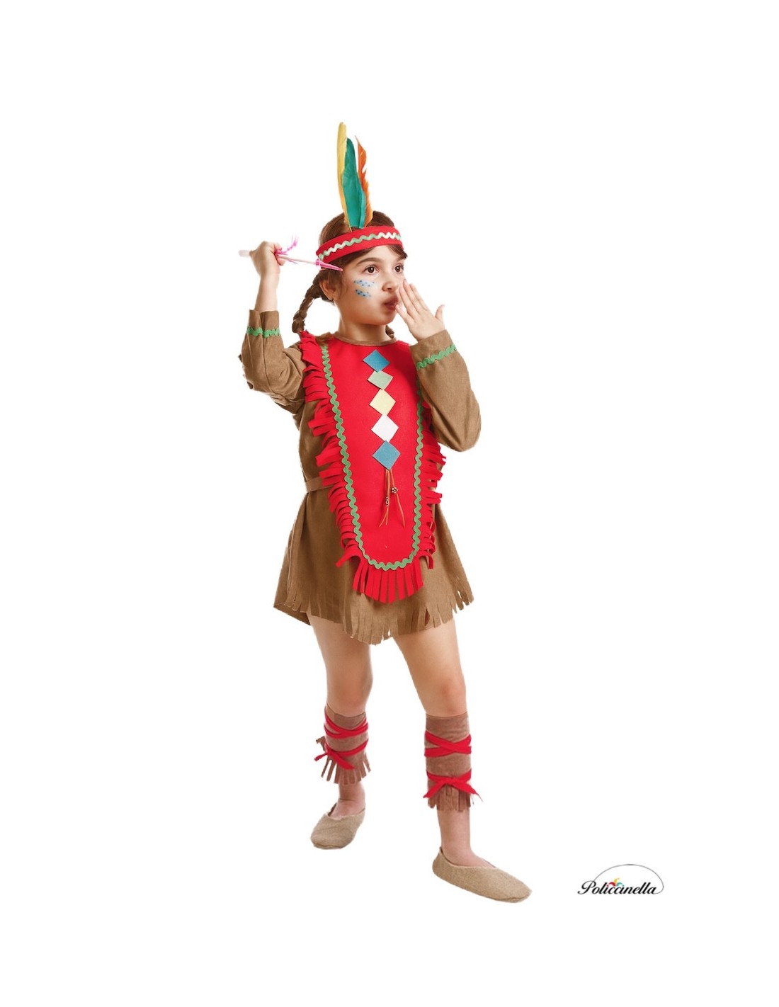 Ce joli déguisement d'indienne, confectionné en polyester doux au toucher velouté, se compose d'une robe avec un corsage d'un rouge vif qui descend presque jusqu'au bas de la robe. La robe est décorée avec les franges typiques et les couleurs caractéristiques du personnage. La manche est courte et est décorée, tout comme la robe, avec une bande de picota ondulée en vert. Le déguisement se ferme à l'arrière au niveau du cou avec du velcro. Il est complété par des chauffe-jambes avec des lacets rouges du même tissu que le reste du costume et un ruban avec trois plumes de couleurs vives, avec un élastique à l'arrière pour ajuster à la tête.