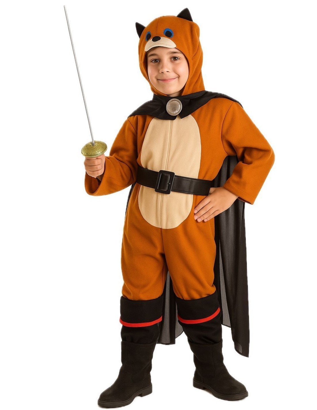 Un déguisement original et sympathique qui allie confort et réalisme. Il se compose d'une combinaison en tissu effet velours côtelé avec fermeture éclair sur le devant et capuche intégrée, ajustée au visage grâce à des élastiques latéraux pour un bon ajustement. La capuche est ornée d'oreilles en mousse qui apportent un volume tridimensionnel, ainsi que des yeux et un nez en tissu dense, donnant une finition expressive. Au niveau des chevilles, un élastique permet de fixer le vêtement à la semelle de la chaussure, évitant ainsi que le pantalon ne remonte lors des mouvements. L'ensemble est complété par une ceinture en satin sur une base de TNT, avec une boucle dorée en plastique, et une cape en satin doux ornée d'une décoration en mousse cousue sur le devant, qui se place en passant par-dessus la tête et se ferme au cou avec du velcro à l'arrière. Un déguisement confortable, amusant et rempli de détails, idéal pour le Carnaval, les fêtes scolaires ou les représentations.
