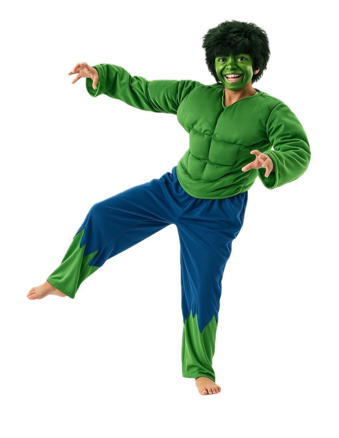 Ce costume, de qualité excellente, se compose de deux pièces : le t-shirt, fabriqué en doux tricot semi-élastique, présente un rembourrage léger mais dense sur le devant et les bras pour imiter la musculature du personnage. Les muscles intérieurs sont recouverts d'un filtre doux pour plus de confort. Le t-shirt se ferme à l'arrière du cou avec du velcro. Le pantalon, fabriqué dans le même tissu confortable que le t-shirt, a une taille élastique et une petite poche intérieure. Le bas du pantalon est de la même couleur verte fluo que le t-shirt pour harmoniser l'ensemble.
