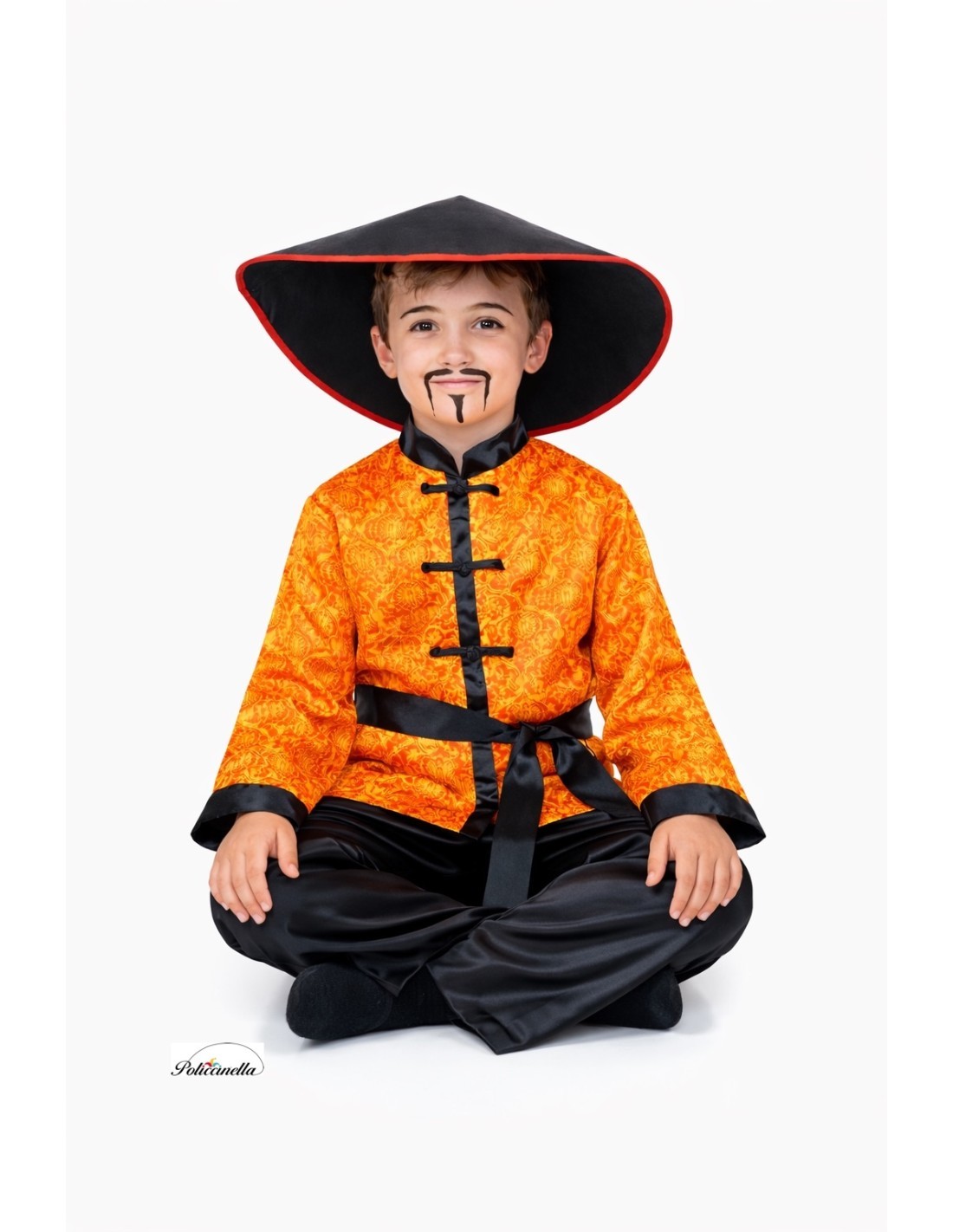 Ensemble inspiré du costume chinois classique, composé d'une chemise en satin doux avec un design de type tangzhuang, simulant la fermeture typique et le col mao. Il s'ajuste confortablement avec du velcro à l'arrière du col. Le pantalon confectionné dans le même matériau, dispose d'une taille élastique et d'une petite poche intérieure. L'ensemble est complété par le traditionnel chapeau chinois en mousse, équipé d'un serre-tête intérieur pour assurer un ajustement ferme, confortable et éviter qu'il ne tombe. Enfin, il comprend une ceinture en satin, de la même couleur que le pantalon. Authentique et plein de charme oriental !