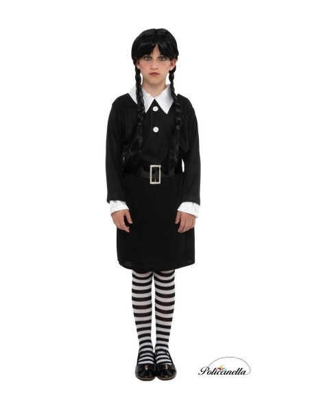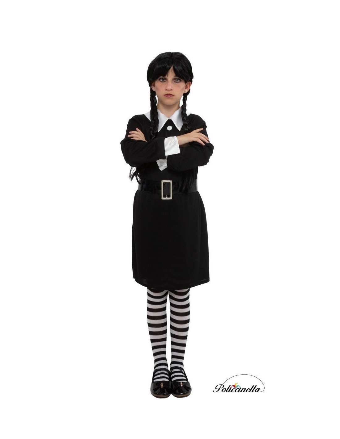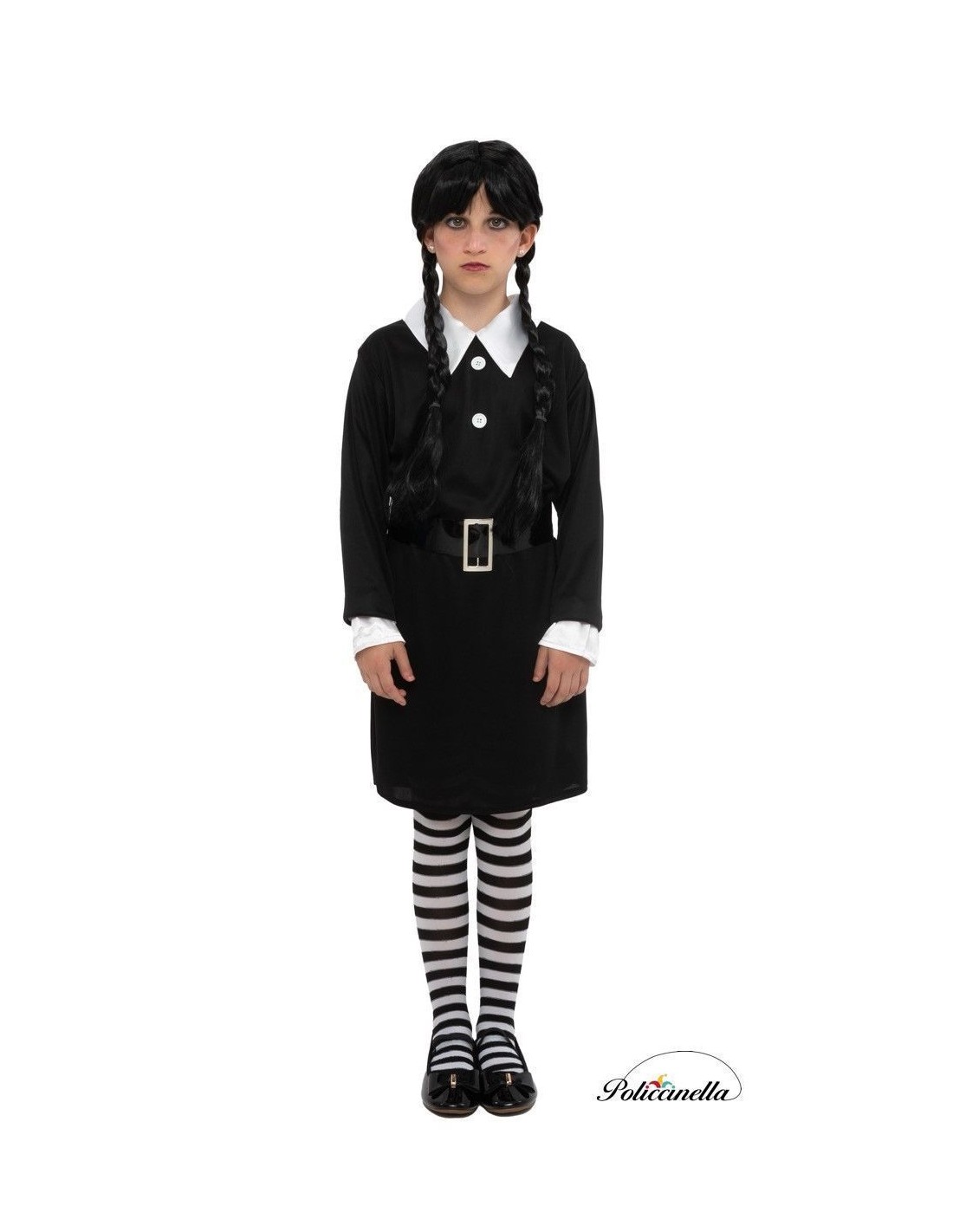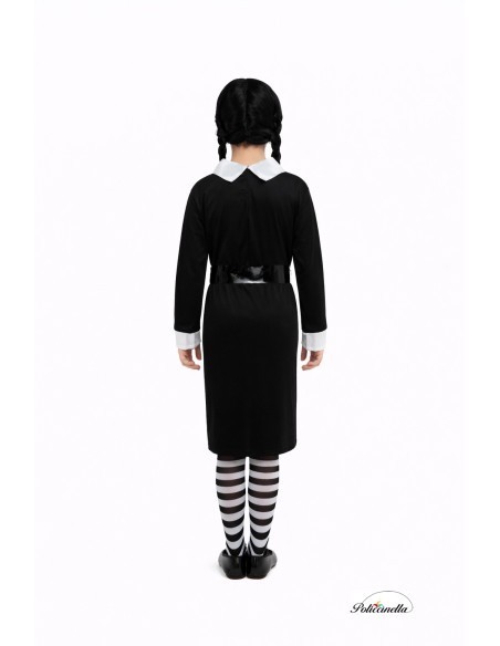 Découvrez l'attrait unique de ce costume, idéal pour se démarquer à Halloween. Fabriquée dans un élégant tricot machine, cette robe noire à manches longues avec des poignets blancs présente une texture douce et légèrement élastique. Sa coupe classique met en valeur la silhouette. Elle arbore un col blanc impeccable avec des boutons décoratifs et une large ceinture qui souligne la taille avec un style gothique et se complète avec des collants à rayures noires et blanches.