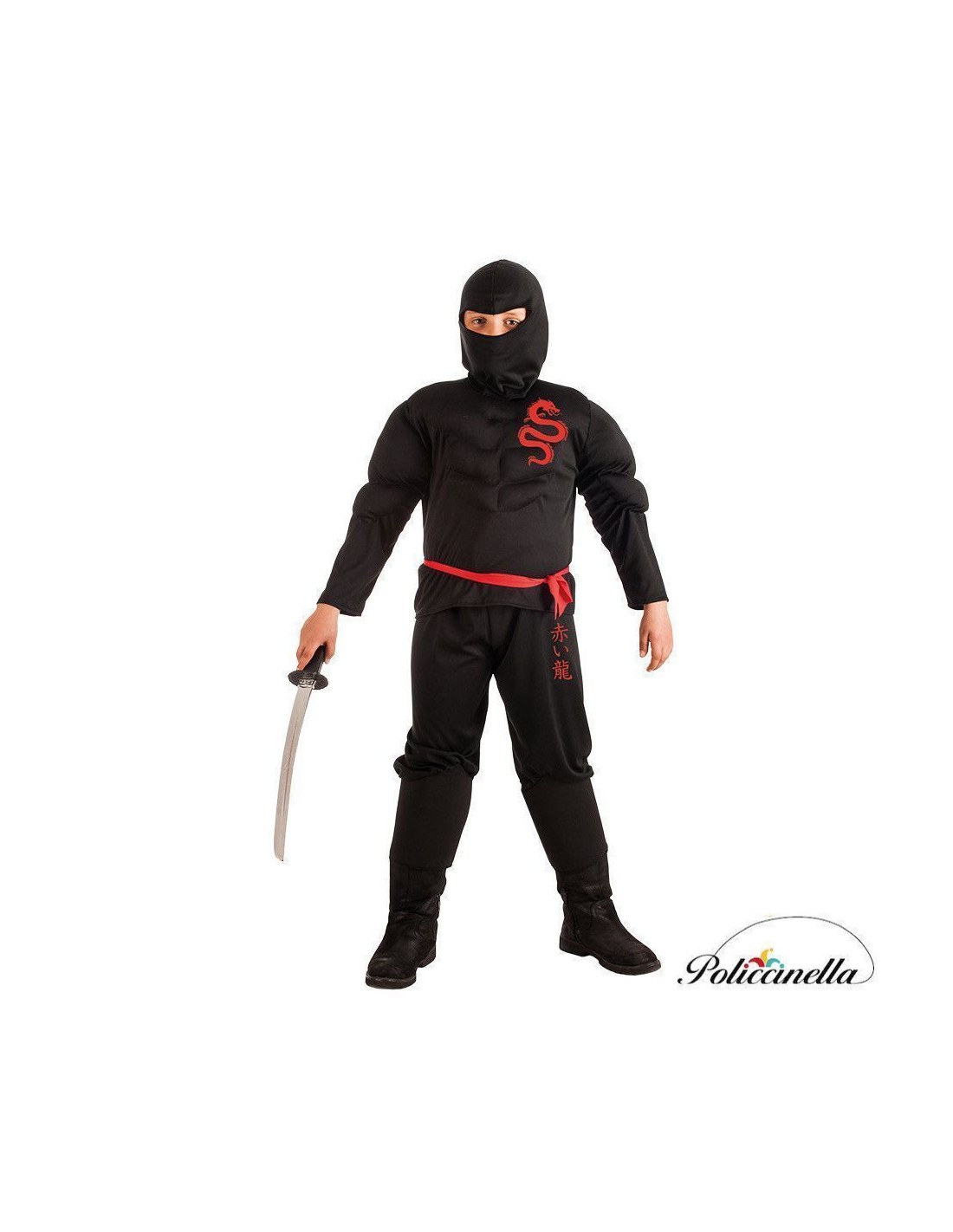 Ce costume complet et confortable de ninja est confectionné dans un doux tissu de machine semi-élastique, idéal pour se déplacer avec agilité. Le t-shirt se ferme au cou à l'arrière avec du velcro et présente des rembourrages sur les bras et la poitrine qui simulent la musculature du personnage. À l'avant, un dragon imprimé sur le tissu lui-même ajoute de la force visuelle au design. Le pantalon assorti, avec une taille élastique et une poche intérieure, comprend des bas en mousse qui couvrent fermement le bas des bottes. Il est complété par une combinaison du même tissu, avec une fermeture au cou et une ceinture pour ajuster à la taille. Léger, résistant et de grande qualité.