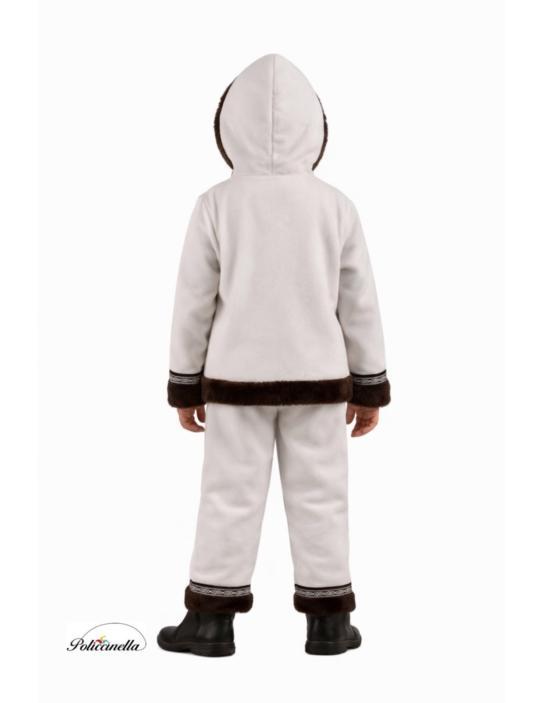Authentique et chaleureux costume d'esquimau pour adulte, composé d'une veste longue avec capuche intégrée, fabriquée dans un tissu en peluche ultra doux et très agréable au toucher. Décorée avec des détails élégants en velours aux poignets, à la capuche, au centre et en bas, à l'avant et à l'arrière, et rehaussée d'un ruban coloré avec un imprimé Sami. Le pantalon, avec une taille élastique et une poche intérieure, comprend les mêmes ornements en bas pour harmoniser l'ensemble. Un design fidèle à la tenue traditionnelle, de grande qualité et d'une finition impeccable.