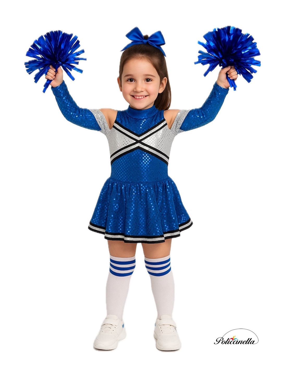 Ce magnifique costume, confectionné en doux tricot semi-élastique avec des paillettes incrustées, se compose d'une jupe évasée confectionnée sur le body et d'un short avec une ouverture pour plus de confort. La fermeture au cou est en velcro à l'arrière et l'ensemble est complété par des chaussettes assorties.