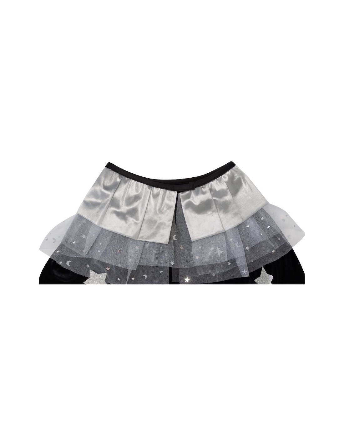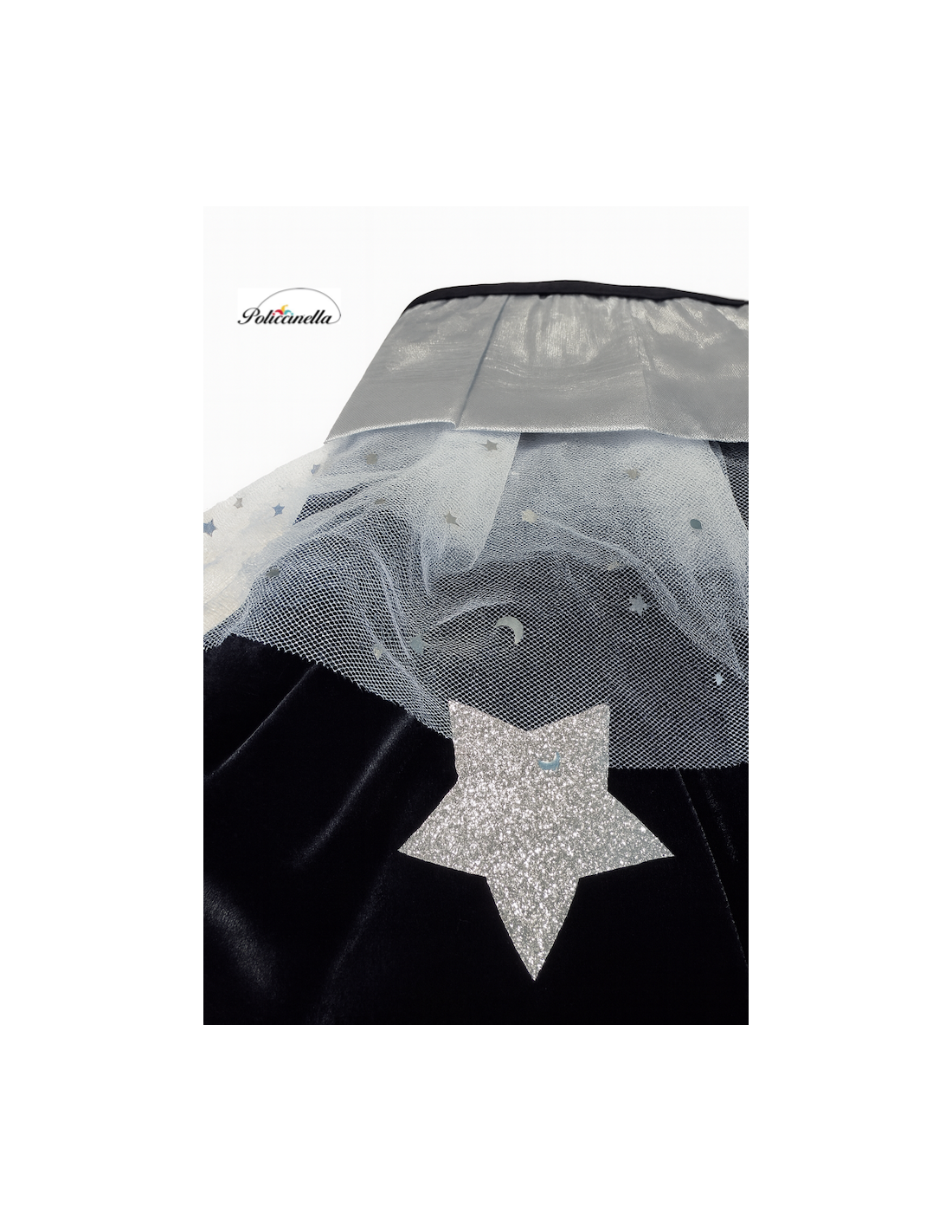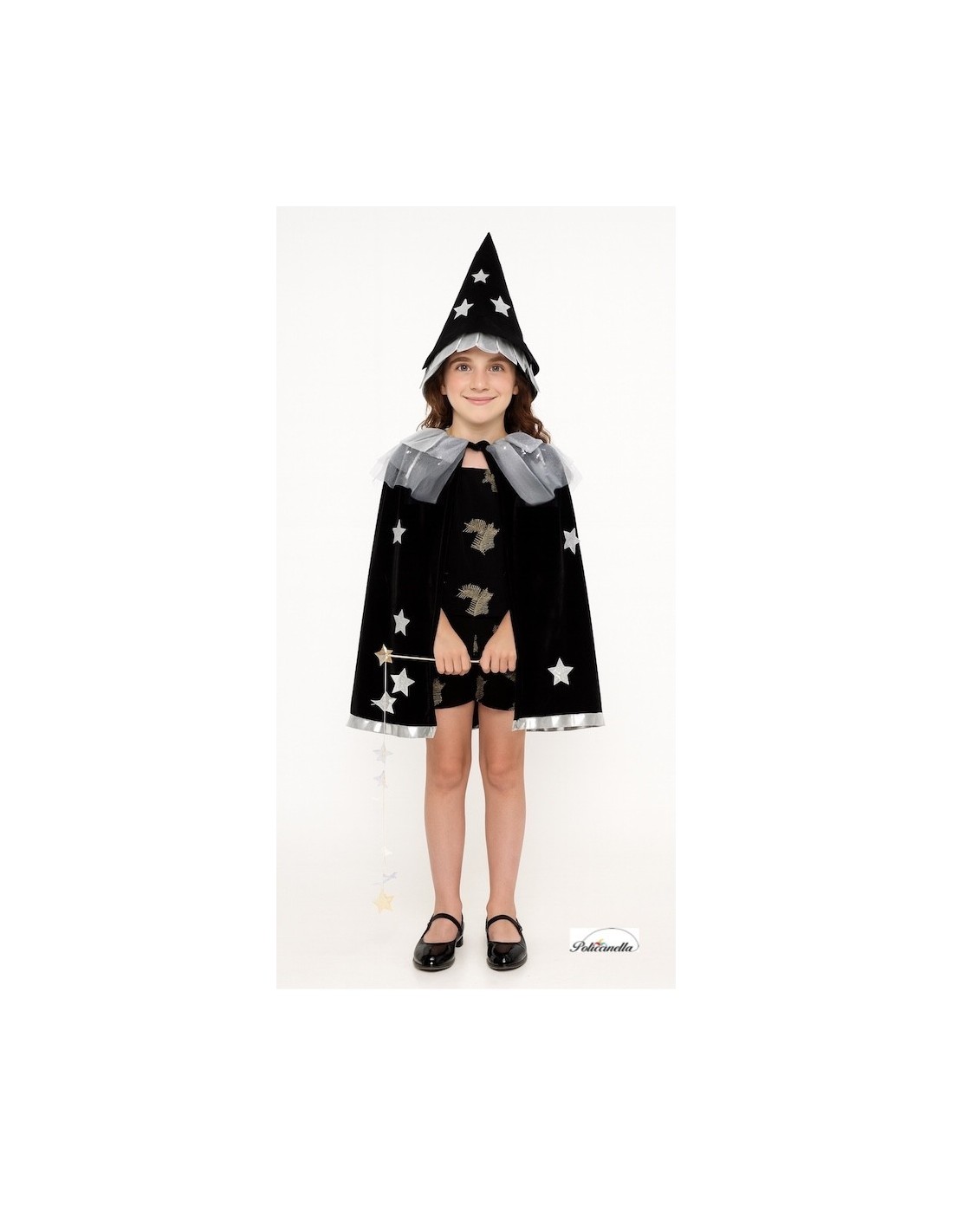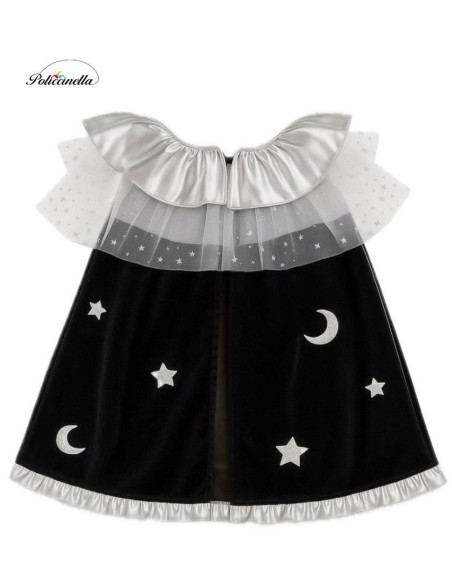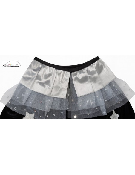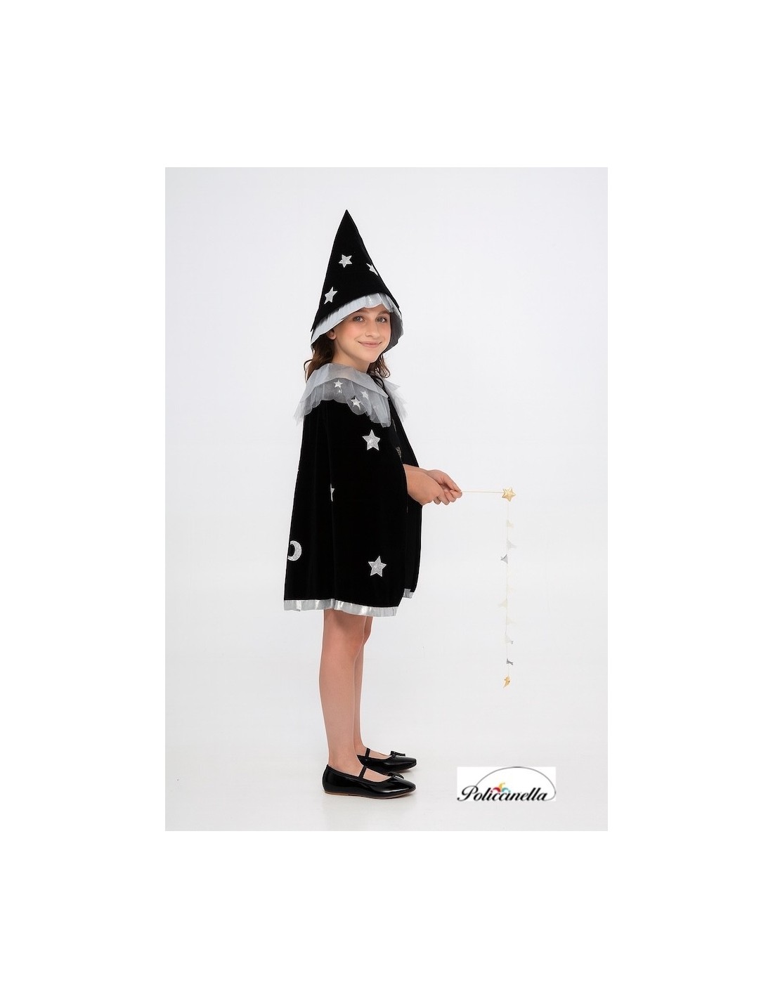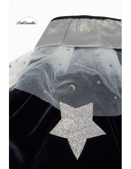 Élégant ensemble composé d'un manteau en velours noir avec une doublure intérieure en jersey, lui donnant du corps et une chute distinguée. Le col est orné d'un bavoir argenté avec du tulle à étoiles, se fermant avec du velcro pour plus de confort. Décoré d'étoiles superposées en polyester argenté, il se marie parfaitement avec le chapeau conique assorti, fabriqué dans le même tissu et avec un élastique à l'arrière pour garantir un ajustement parfait à la tête. Un design de grande qualité et une confection exquise, pensé pour les filles élégantes et distinguées qui souhaitent se démarquer lors de toute fête ou célébration.
