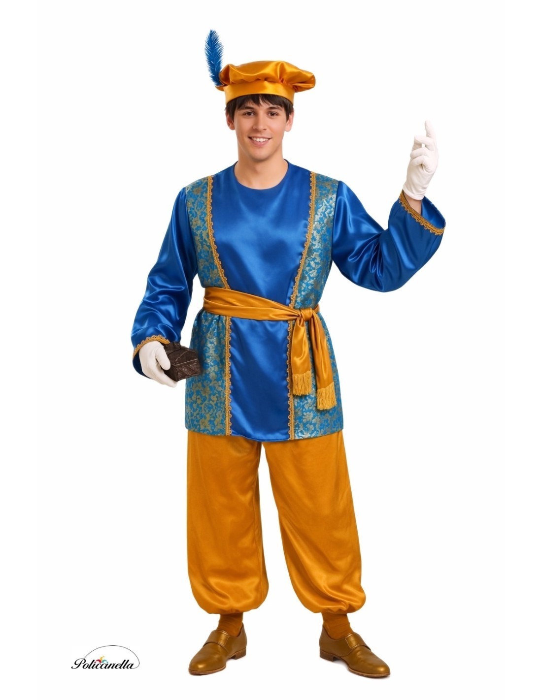Tradizionale costume da paggetto, elegante e ricco di dettagli. Include una camicia in morbido raso con chiusura a strappo sul retro del collo, decorata sul davanti con stoffa dall'effetto broccato dorato e con delicata passamaneria, presente anche sulle maniche. Il completo si completa con un pantalone con elastico in vita e alle caviglie, una cintura e il caratteristico cappello decorato con piuma e elastico posteriore per una comoda vestibilità, realizzati nello stesso tessuto coordinato. Un abito appariscente e comodo per l'occasione!