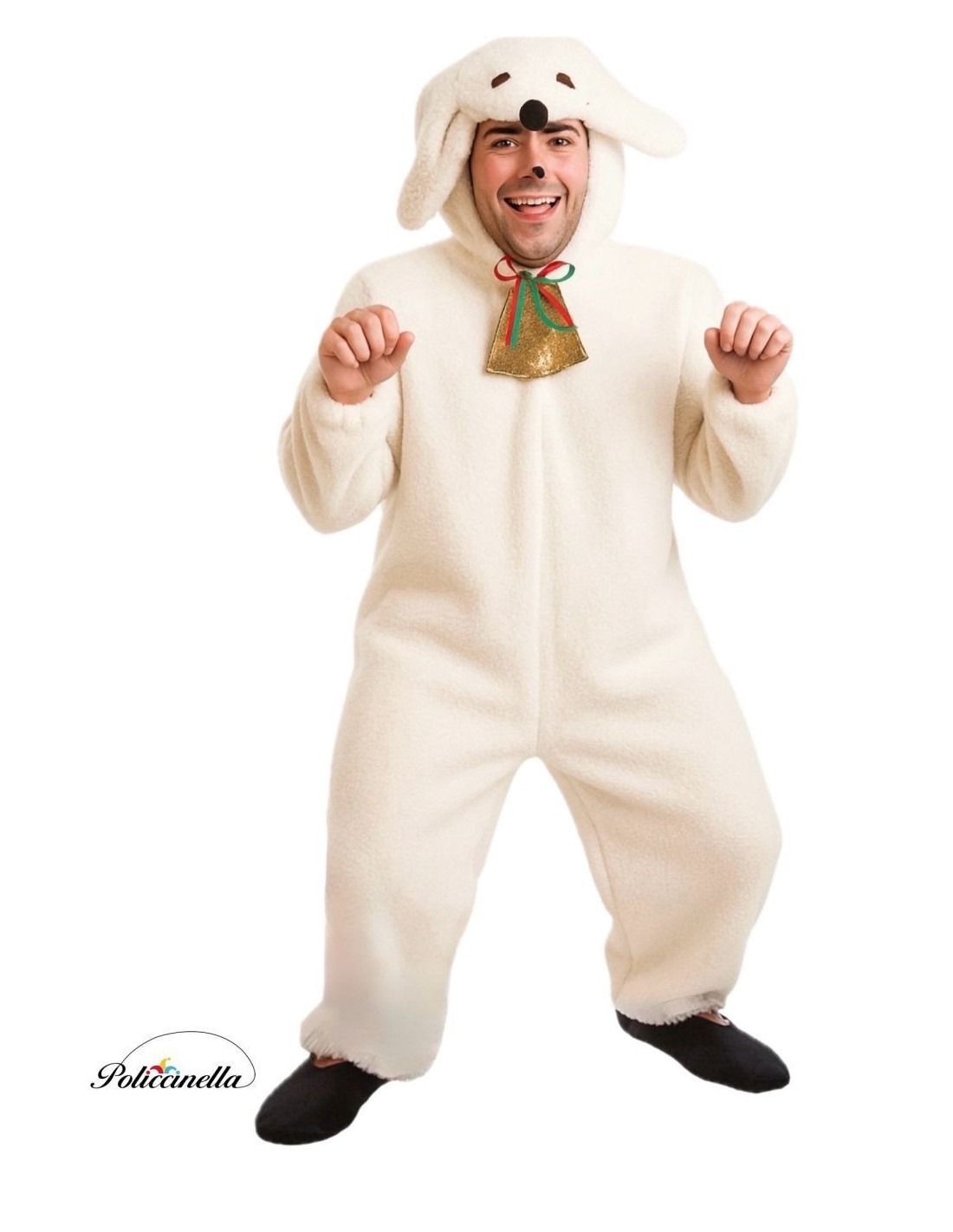 Questo morbido e amorevole costume consiste in una tutina con cappuccio, realizzata in morbido e fitto poliestere con punto di peluche. Presenta nella parte anteriore una zip dall'alto verso il basso, oltre a un ornamento a livello del collo a forma di campana e fiocchi realizzati in schiuma dorata. Il cappuccio, cucito alla tutina, ha due orecchie robuste e rigide per mantenere la forma. Nella parte posteriore, c'è un pon-pon a mo' di coda.