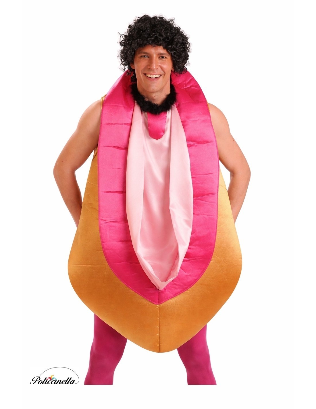 Questo costume, dal design originale e divertente, è composto da un'unica pezza che copre l'intero corpo. È realizzato in morbido poliestere foderato sulla parte anteriore e in maglia semielastica sulla parte posteriore. Ha aperture su entrambi i lati per le braccia. Il collo anteriore è decorato con una boa nera.