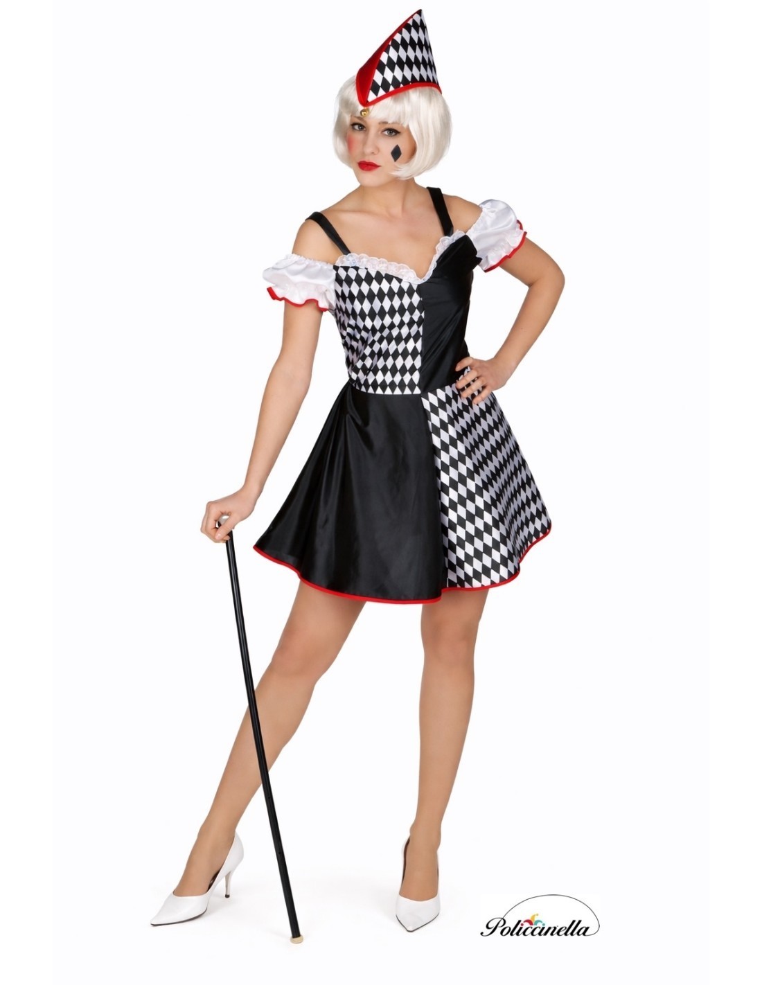 Abito corto realizzato in tessuto di raso, con chiusura sul retro tramite cerniera invisibile e collo a barca, decorato con pizzi e spalline per una maggiore stabilità e comfort. Le maniche corte elasticizzate sono decorate con un bordo rosso, così come il bordo della gonna e il CAPPELLO realizzato in raso foderato per mantenere la sua struttura/forma e con una graziosa campanella sulla punta.