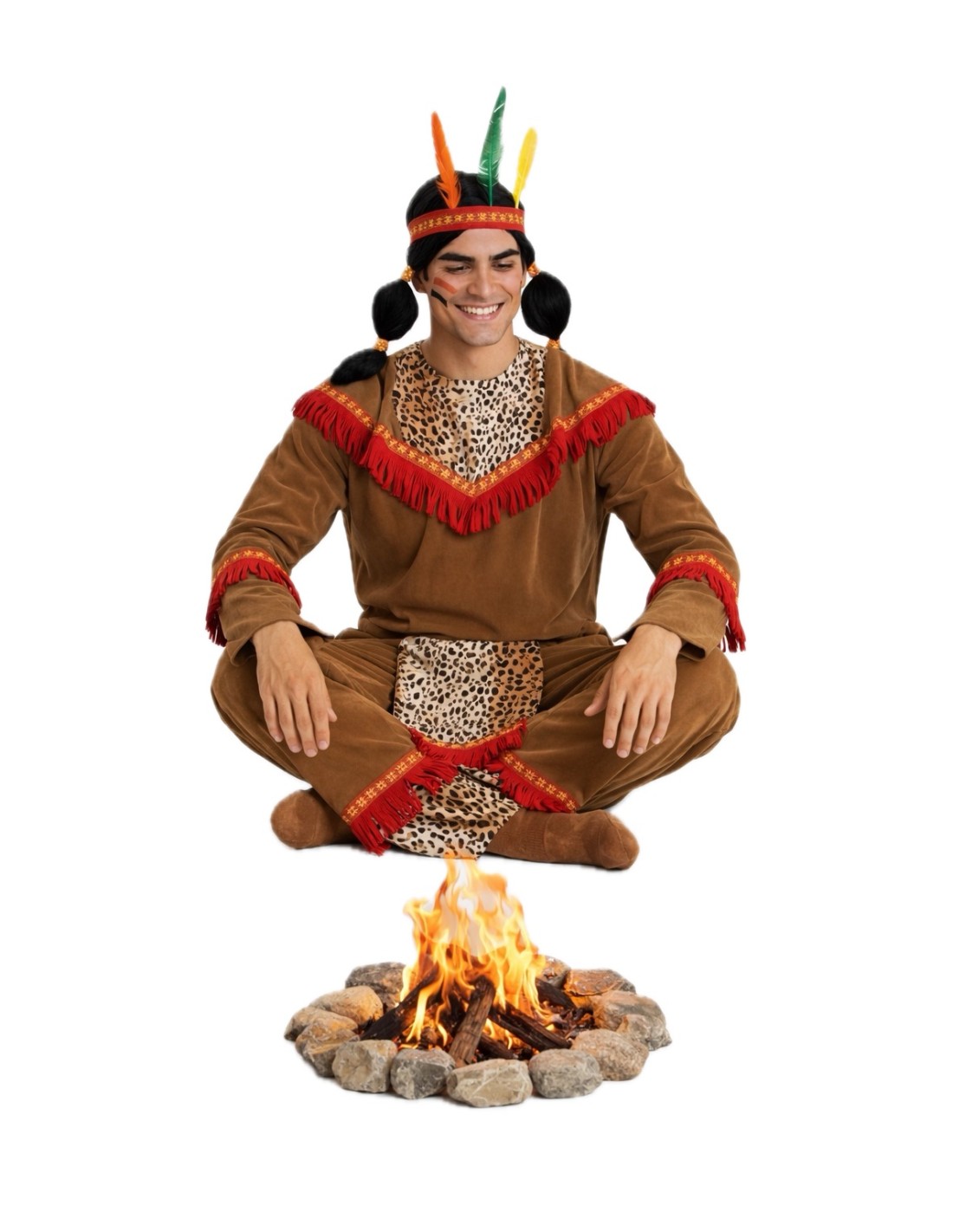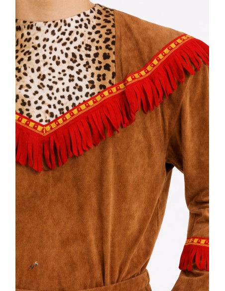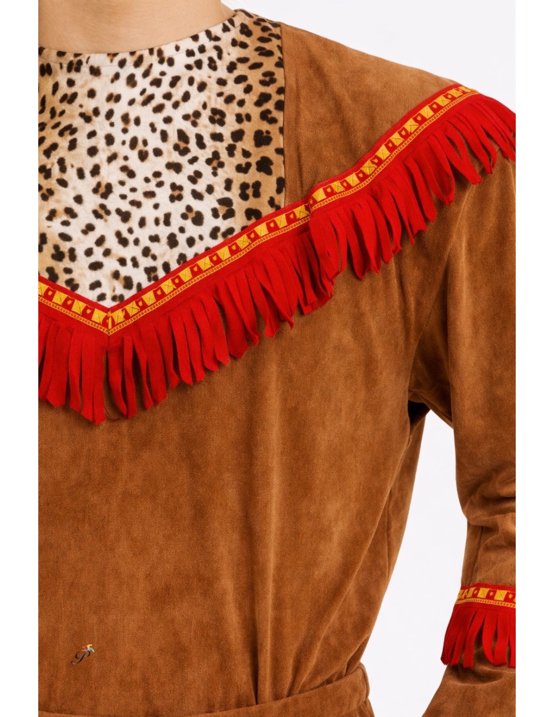 Questo costume, realizzato con un tessuto morbido simile al velluto, imita l'abito caratteristico degli indigeni del West, che utilizzavano pelli di animali cacciati per la sua realizzazione. La giacca si chiude con del velcro nella parte posteriore del collo. Sopra di essa, è stato realizzato un petto con stampa animalier, decorato con frange e nastro stampato, lo stesso utilizzato per il copricapo, che si regola con un elastico. Il pantalone, con elastico in vita e tasca interna, presenta la stessa decorazione alle caviglie del petto. Il costume si completa con un grembiule che si armonizza con il resto del costume in termini di tonalità, tessuto e dettagli, e si stringe in vita con un nastro.