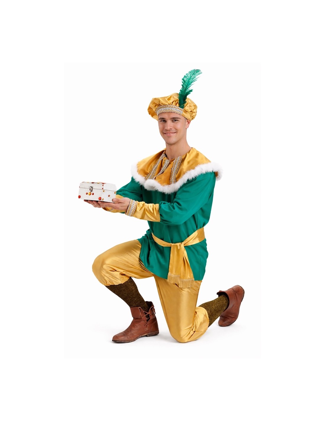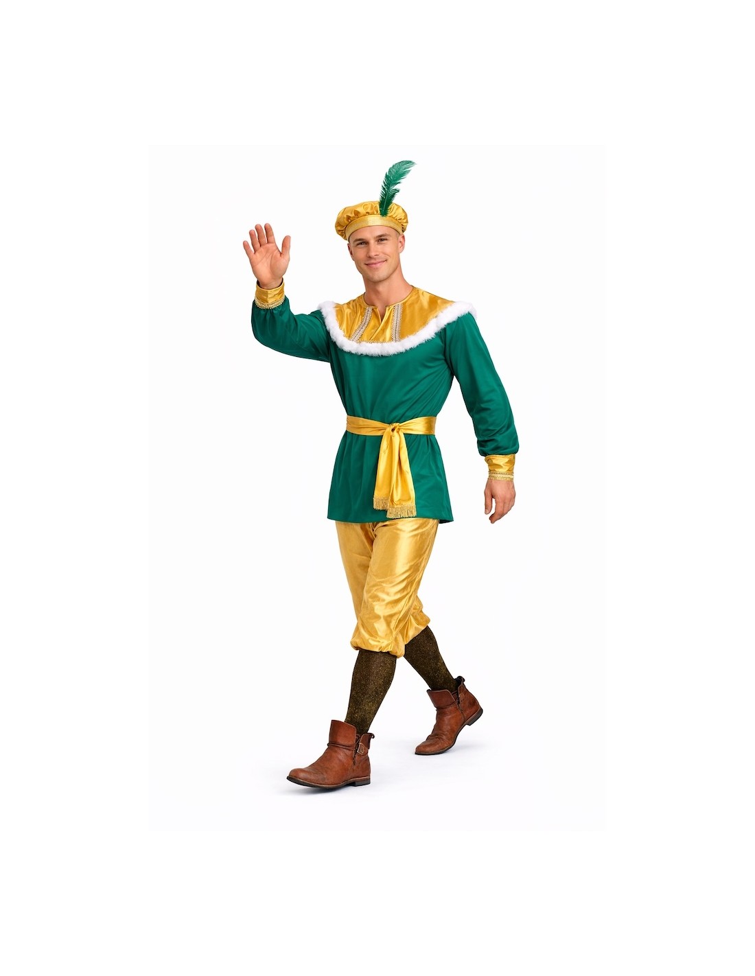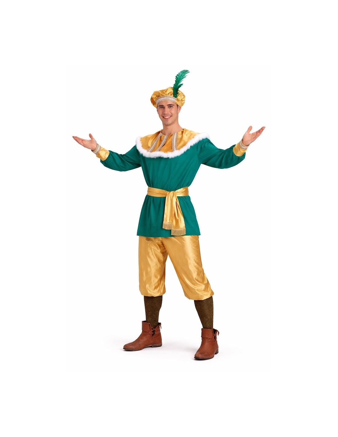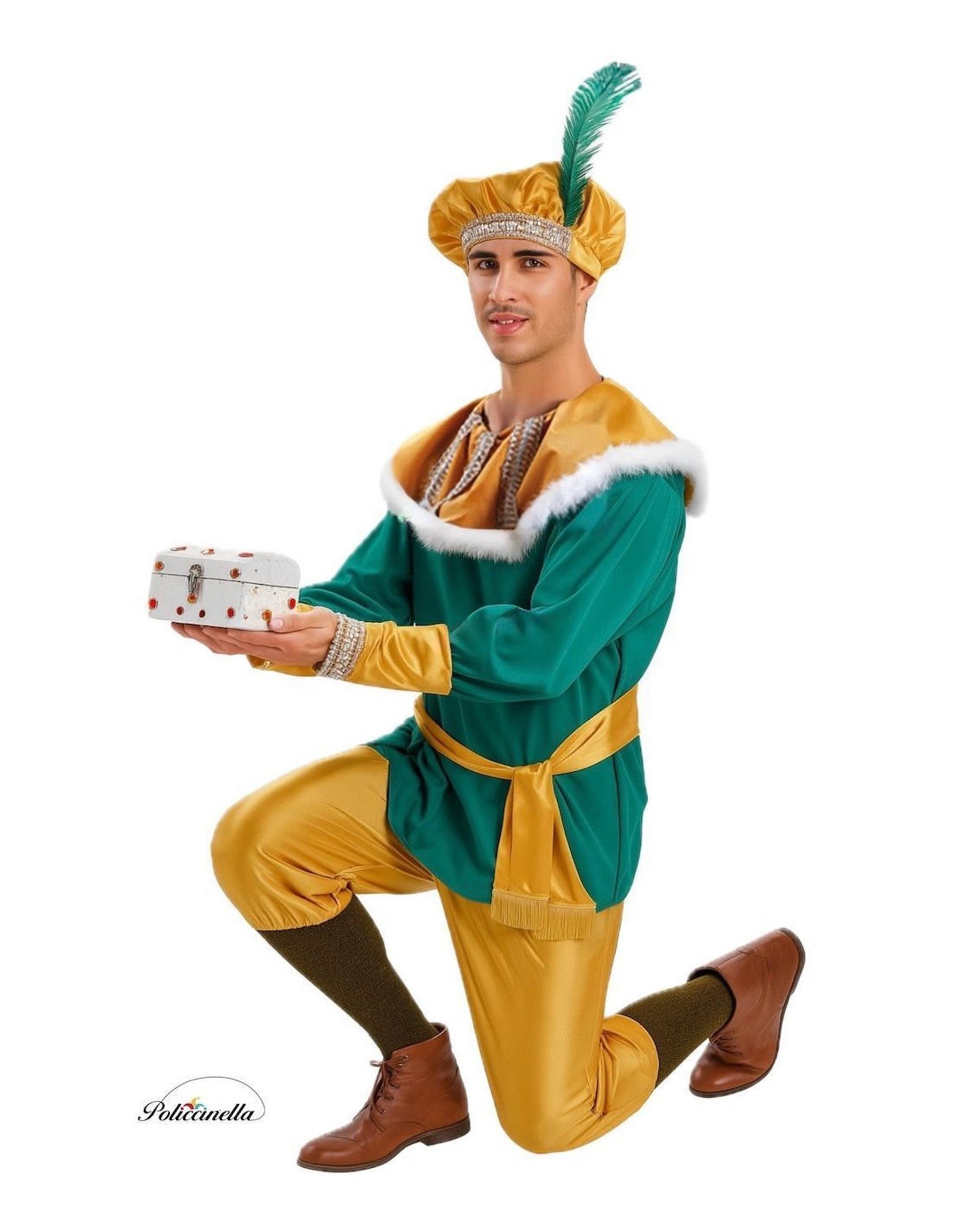 Include una giacca in morbido raso con chiusura in velcro e collo in velluto, decorata con boa e delicati passamanerie sul collo e sui polsini. I pantaloni, anch'essi in raso, hanno elastico in vita e sulle gambe per un maggiore comfort. Completa il set una bella cintura con frange e berretto decorato con piuma e passamanerie abbinati. Entrambi realizzati nello stesso tessuto del resto del costume. Un outfit vistoso, comodo e ricco di dettagli per apparire come un vero paggio reale.