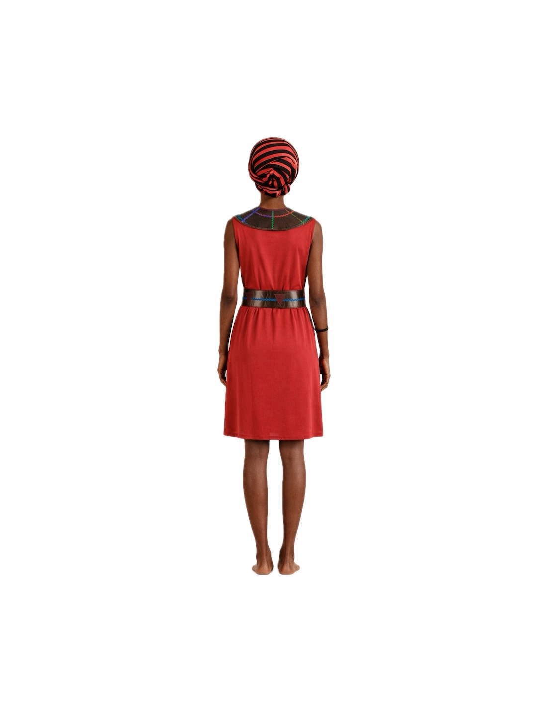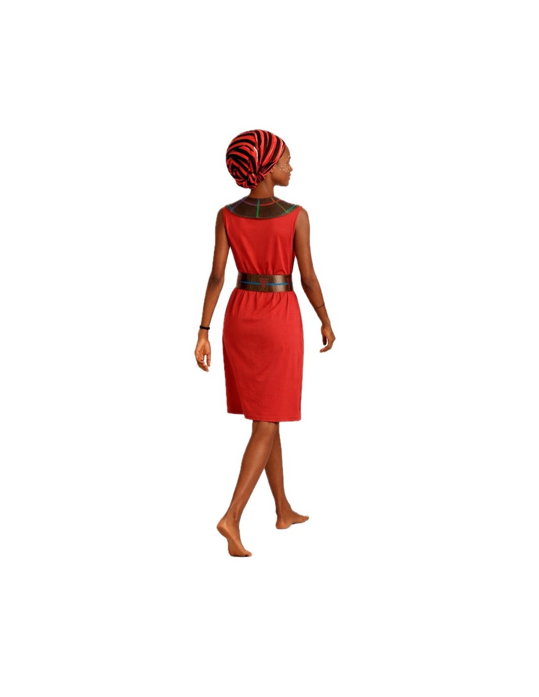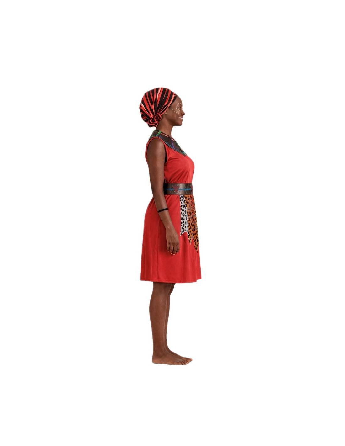 Elegante abito realizzato in morbido tessuto semi-elastico a maglia, con chiusura a velcro sul collo e maniche in chiffon semi-trasparente che conferiscono leggerezza. Si distingue per il suo collo di tipo collar tribale, realizzato in poliestere foamizzato per dare corpo, decorato con onde colorate e pezzi di feltro cuciti, con chiusura posteriore a velcro. Il set è completato da una cintura coordinata, da cui parte un grembiule decorativo con stampa animalier a forma di perizoma. Ideale per rappresentazioni culturali, eventi scolastici o a tema. Autentico e accattivante!