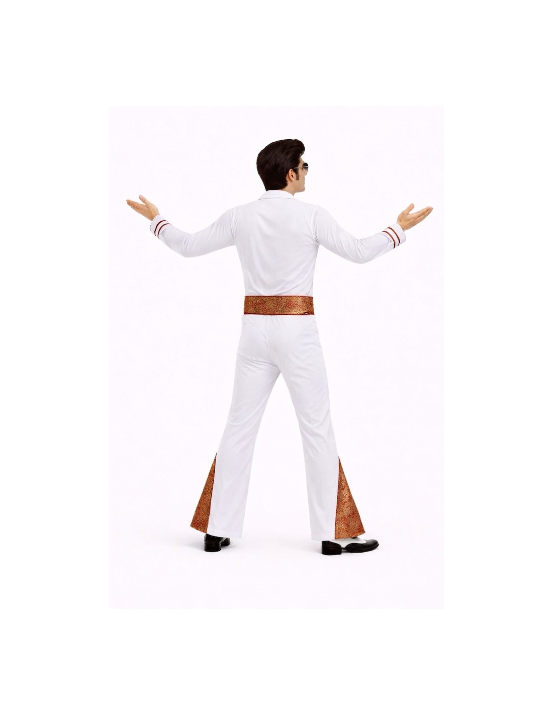 Iconico set ispirato agli anni '70, realizzato in morbido tessuto semielastico a maglia. La camicia si distingue per il suo grande colletto strutturato, decorato con paillettes e tessuto dorato rigido, presente anche ai polsini per un maggiore impatto scenico. I pantaloni, con fondo a zampa abbinato al petto della camicia, includono vita elastica e pratiche tasche interne. Completano il look una cintura in tessuto lucido regolabile con fiocco. Ideale per spettacoli, feste a tema o per rivivere l'autentico spirito del rock & roll.