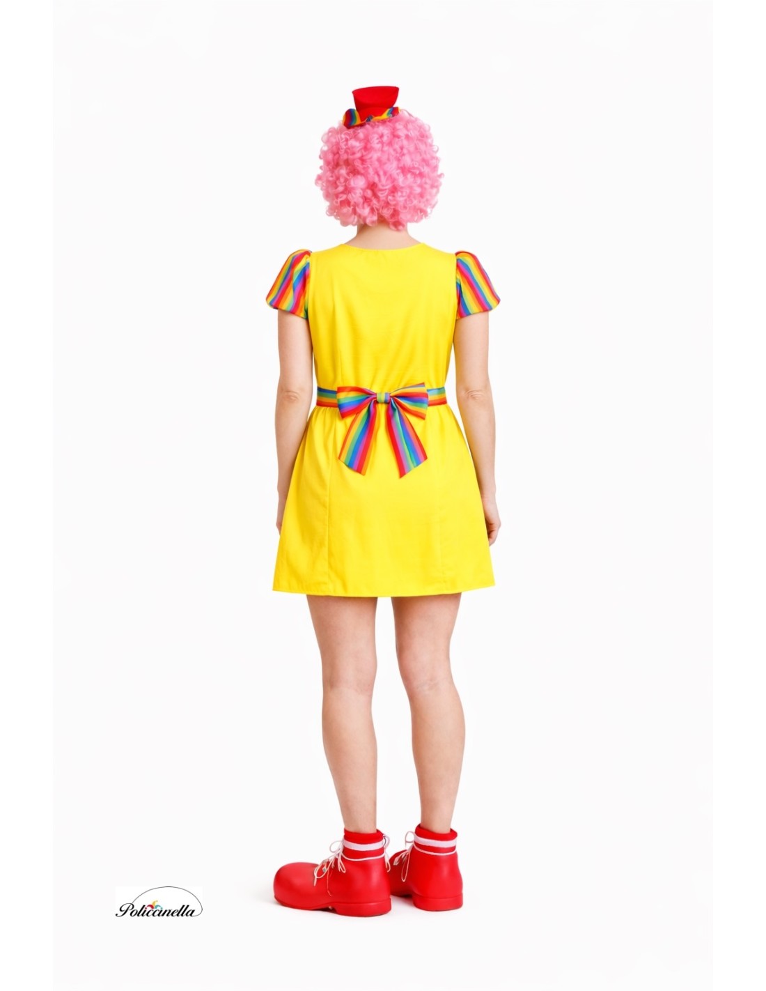 Vestito allegro e comodo, realizzato in morbido tessuto a maglia semi-elastico. Presenta un collo a scatola con elastico per una migliore adattabilità, vita con cintura integrata per una vestibilità favorevole e elastico sui polsi per un maggiore comfort. La parte anteriore presenta una stampa colorata e divertente, mentre il retro è liscio in tonalità gialla, abbinata al centro della gonna. Include una cravatta di tulle verde limone con elastico da mettere intorno al collo. Ideale per animazioni, feste e spettacoli. Comfort e simpatia in un unico vestito!