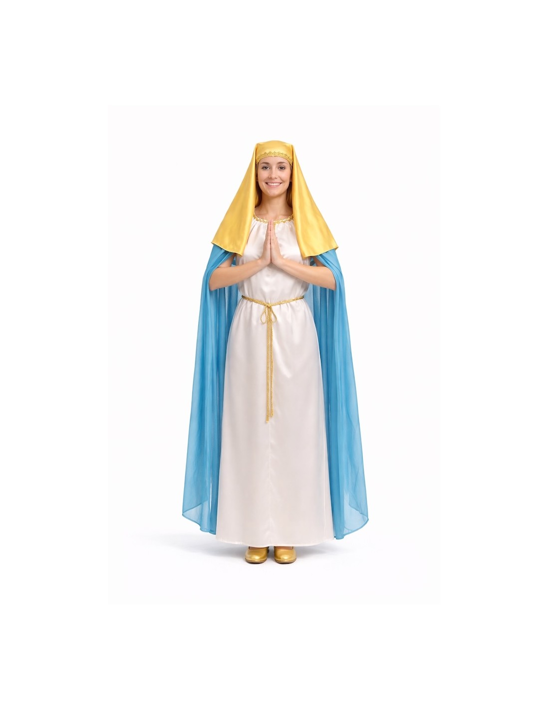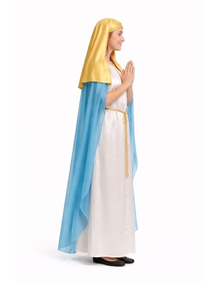 Costume di alta qualità della Vergine Maria, ideale per rappresentazioni natalizie ed eventi religiosi. Include una tunica di raso morbido con delicata passamaneria, chiusura frontale con velcro e cordoncino dorato in vita che valorizza la figura. Il mantello, integrato dalle spalle fino in basso, conferisce un tocco solenne e autentico. Il velo, anch'esso di raso, si adatta comodamente grazie al suo elastico posteriore, garantendo che resti al suo posto.