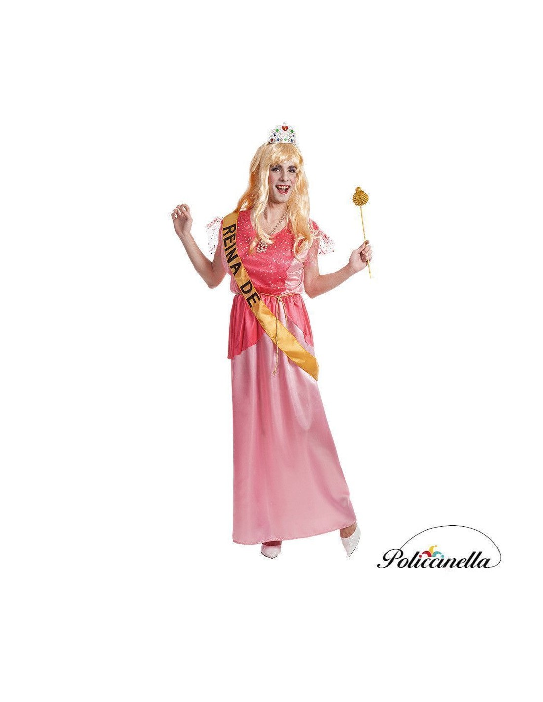 Questo costume da principessa rosa, ideale per un addio al celibato, presenta un abito con la parte superiore realizzata in un morbido tessuto a maglia con brillantini. Questa parte è rivestita di tulle decorato con paillettes, è senza maniche e presenta dettagli di tulle sulle spalle. La parte inferiore combina un tessuto lucido in rosa intenso, dello stesso materiale della parte superiore, che cade sull'abito. Il resto dell'abito è realizzato in raso. Include una fascia dorata di raso cucita sulla spalla e un cordino avvolto, anch'esso dorato, che si lega in vita con un fiocco, aggiungendo struttura e stile. La chiusura avviene tramite un sistema di velcro sul retro per una maggiore adattabilità.