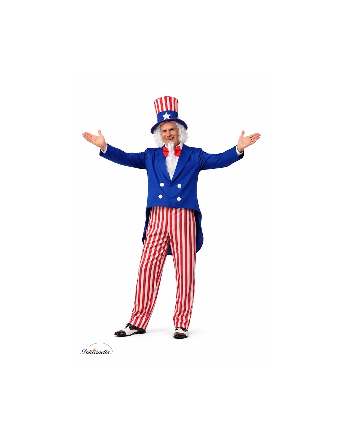 Questo costume si distingue per la sua curata realizzazione e per la grande qualità di ogni dettaglio. La giacca tipo levita, in poliestere denso e morbido, si chiude comodamente con del velcro e si decora con pezzi di feltro sul davanti. I pantaloni, in raso leggero con elastico in vita, offrono comodità e libertà di movimento, mentre il papillon di raso spumoso con chiusura al collo aggiunge un tocco elegante e vistoso. Il pezzo forte del costume è il suo spettacolare cilindro di raso, realizzato su una base spugnosa per mantenere la sua forma impeccabile, decorato con stelle di feltro che enfatizzano il suo aspetto patriottico. Un insieme resistente, comodo e vistoso, ideale per sfilate, cavalcate e feste a tema dove si vuole brillare con stile.
