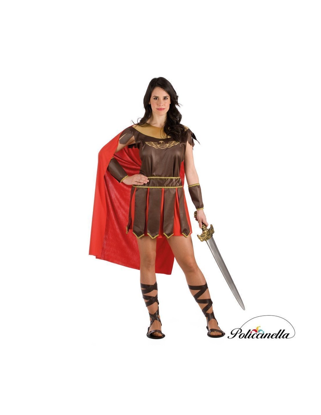 Costume di romana composto da un vestito completo realizzato in tessuto semielastico a maglia, dal tocco morbido e vestibilità comoda. Include applicazioni frontali simili a listelli con finitura visiva simile al cuoio per maggiore realismo. Il collo dorato, strutturato con schiuma interna, conferisce rigidità e forma. Integra un mantello posteriore in tessuto coordinato che aggiunge movimento al design. Completato da polsini realizzati nello stesso materiale simile al cuoio, montati su una base di feltro e con chiusura a strappo per una regolazione rapida e sicura. Un insieme leggero, resistente e dall'estetica coerente con il personaggio che rappresenta.