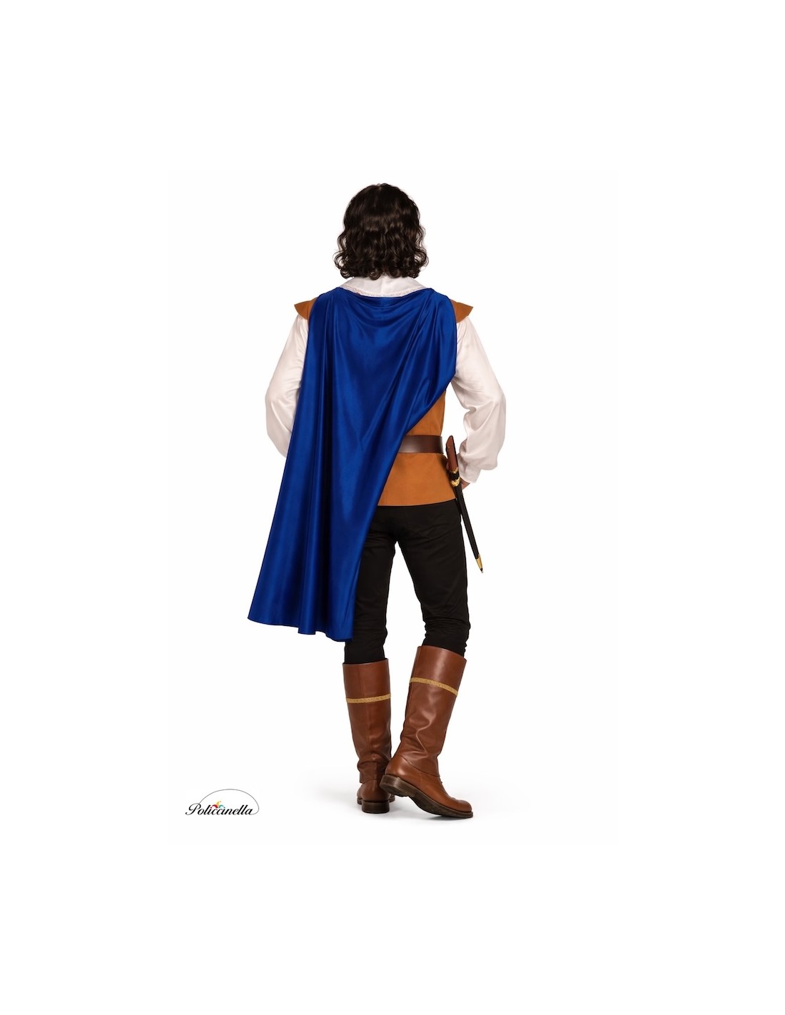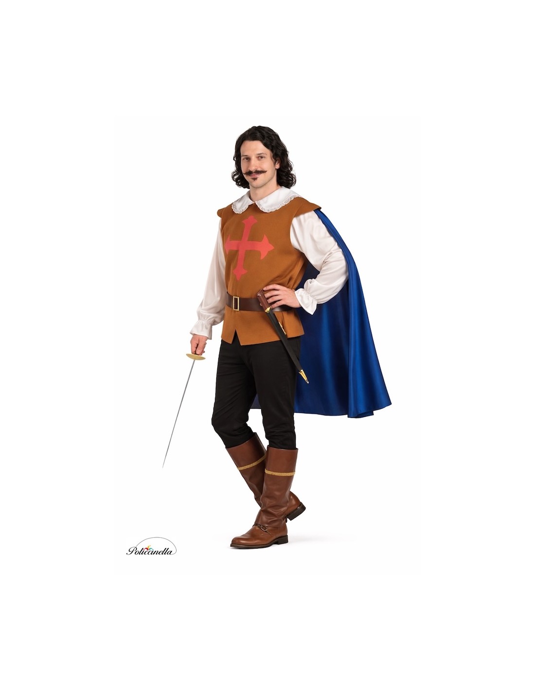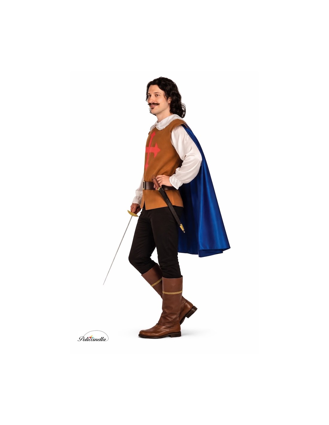 Questo costume di moschettiere include un gilet integrale che combina l'aspetto di una camicia bianca sottostante, realizzata in raso con un collo tipico dell'epoca, decorato con pizzi e maniche elastiche sul fondo per maggiore volume, creando l'effetto di due capi in un'unica pezza. Il gilet, in punto di macchina foderato, presenta un disegno stampato sul davanti e spalline esterne. Include un mantello di raso, unito al gilet con velcro. I pantaloni neri, in punto di macchina, hanno un elastico in vita per una migliore vestibilità. Viene aggiunta una cintura marrone scuro in poliestere intessuto su feltro, dall'aspetto di pelle, con fibbia rettangolare dorata funzionale, oltre al gambale degli stivali, dello stesso tessuto con passamaneria dorata per un tocco distintivo.