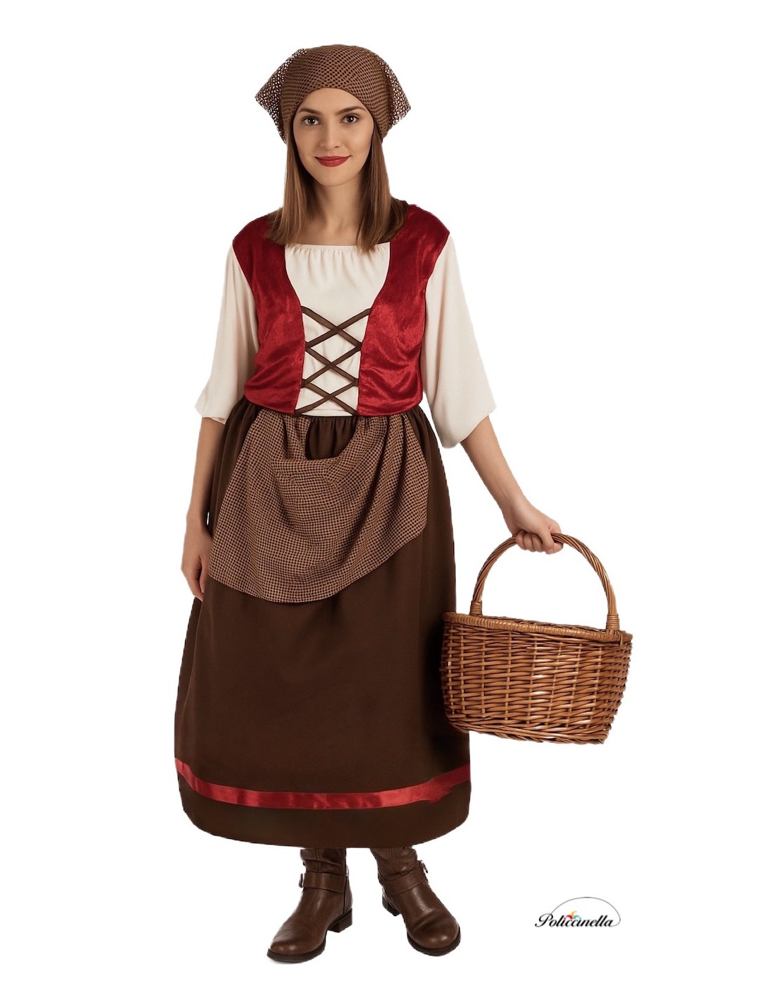 Questo costume combina una camicetta e un gilet in un unico capo, progettato per sembrare due pezzi distinti mentre offre il comfort di un unico indumento. La camicetta, realizzata in morbido jersey, ha maniche elasticizzate fino al gomito. Incorpora un gilet di velluto color vino cucito direttamente, con nastri marroni che simulano una chiusura e un elastico sul retro in vita per una maggiore adattabilità. L'insieme si completa con una gonna in poliestere, con elastico in vita, che consente una vasta gamma di taglie (circa 36/44). Il bordo della gonna include un nastro di raso che si armonizza con il gilet cucito sulla camicetta. Si completa con un grembiule di rete marrone e una sciarpa, entrambi realizzati nello stesso materiale.
